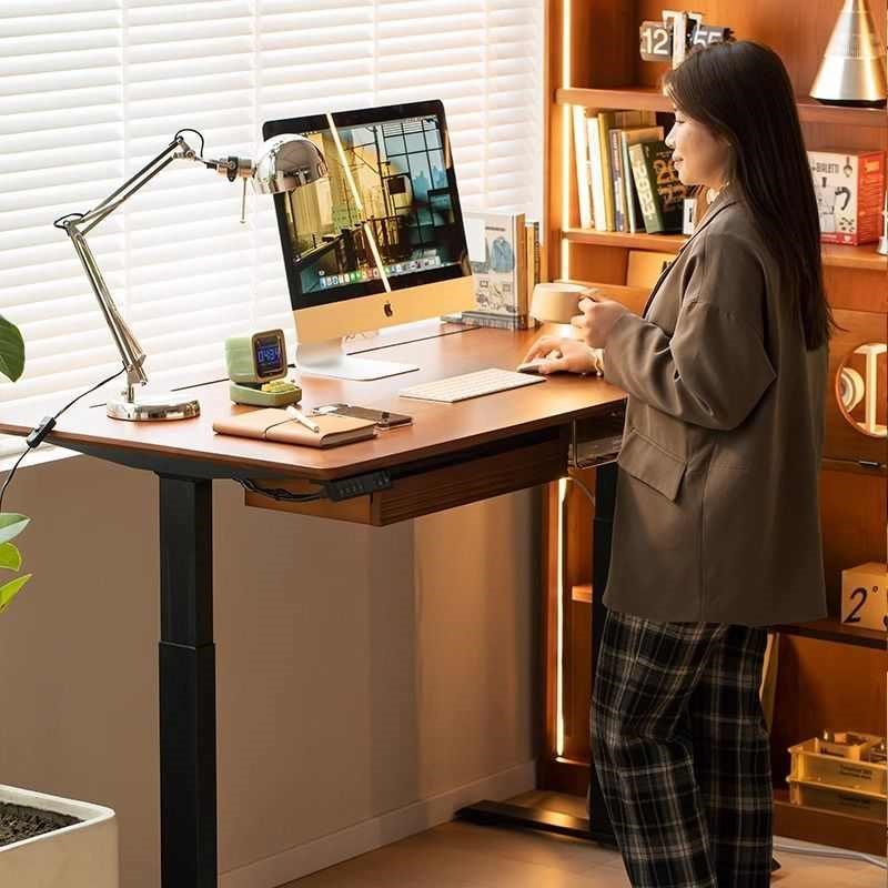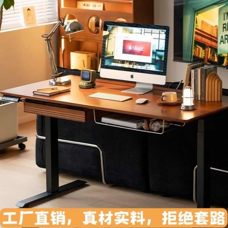 复古智能升降书桌实木简约双电机电竞升降桌中古小户型学习电脑桌