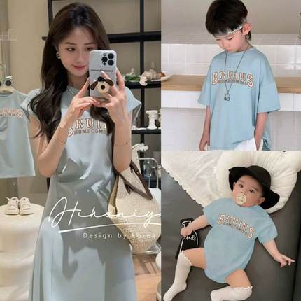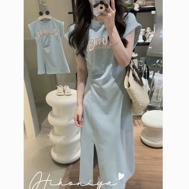 2025夏季新款显瘦亲子字母飞袖韩版亲子装母子母女印花童装连衣裙