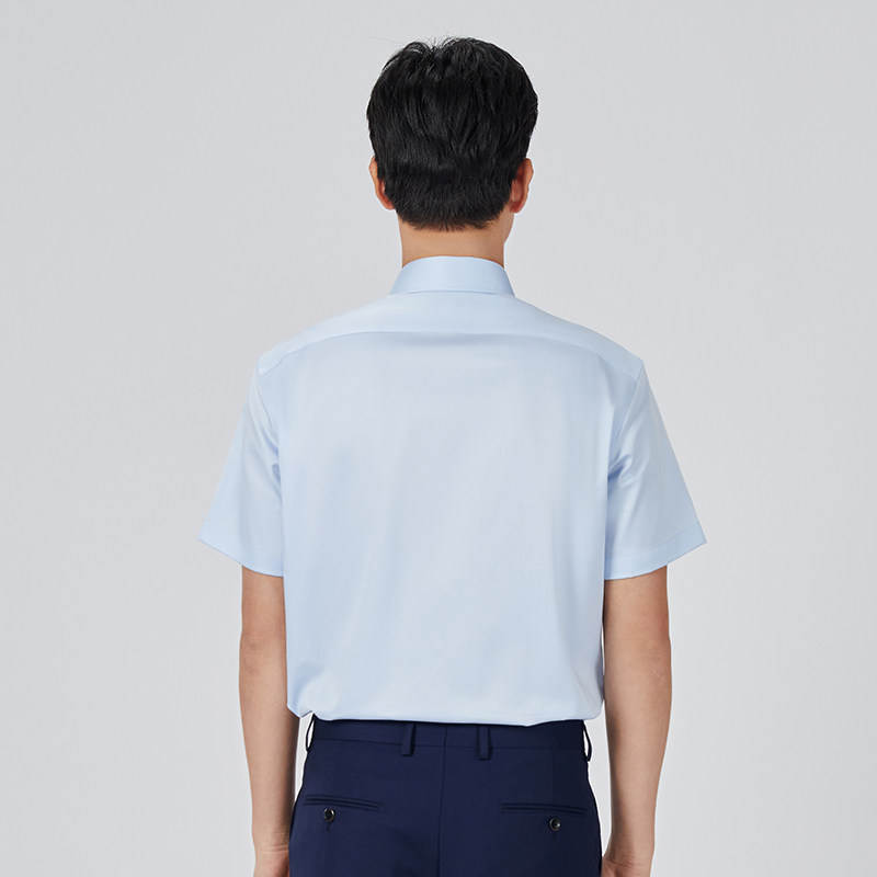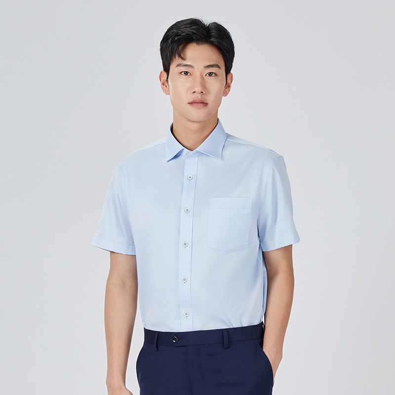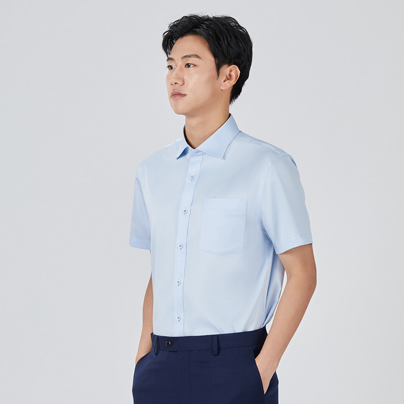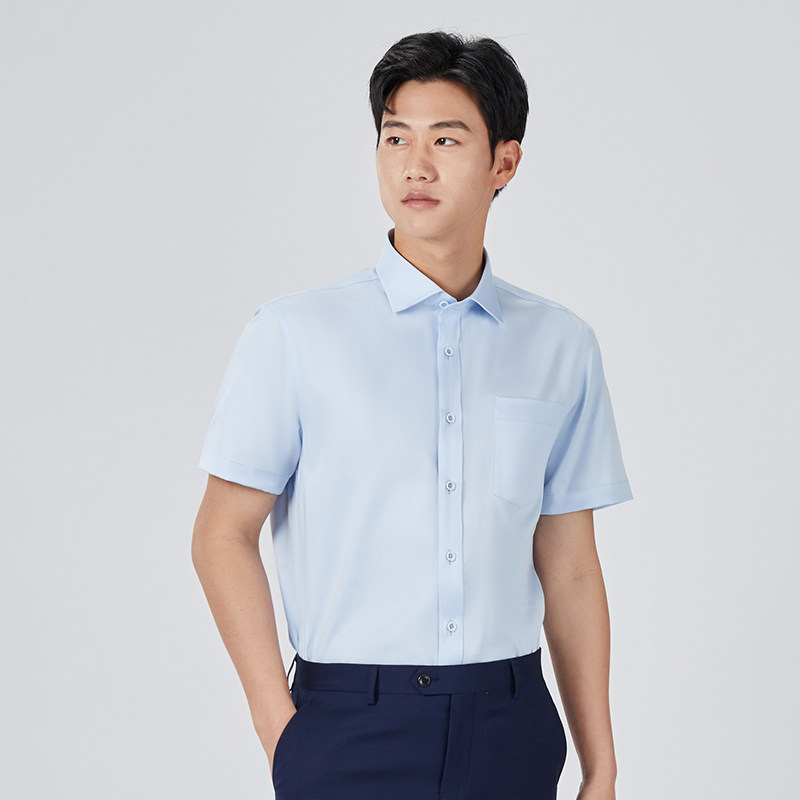 乔治白春夏男士短袖衬衫浅蓝温莎领衬衣直筒微弹商务休闲上衣口袋