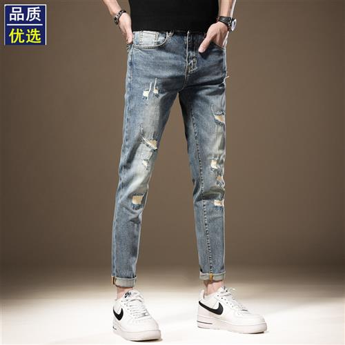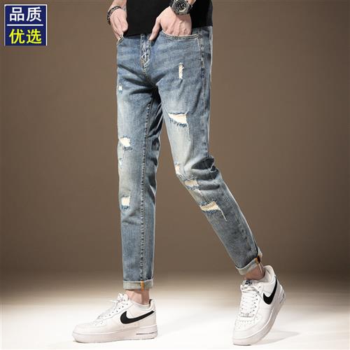 高端九分破洞牛仔裤男修身小脚春秋新款浅蓝色休闲弹力韩版裤子男