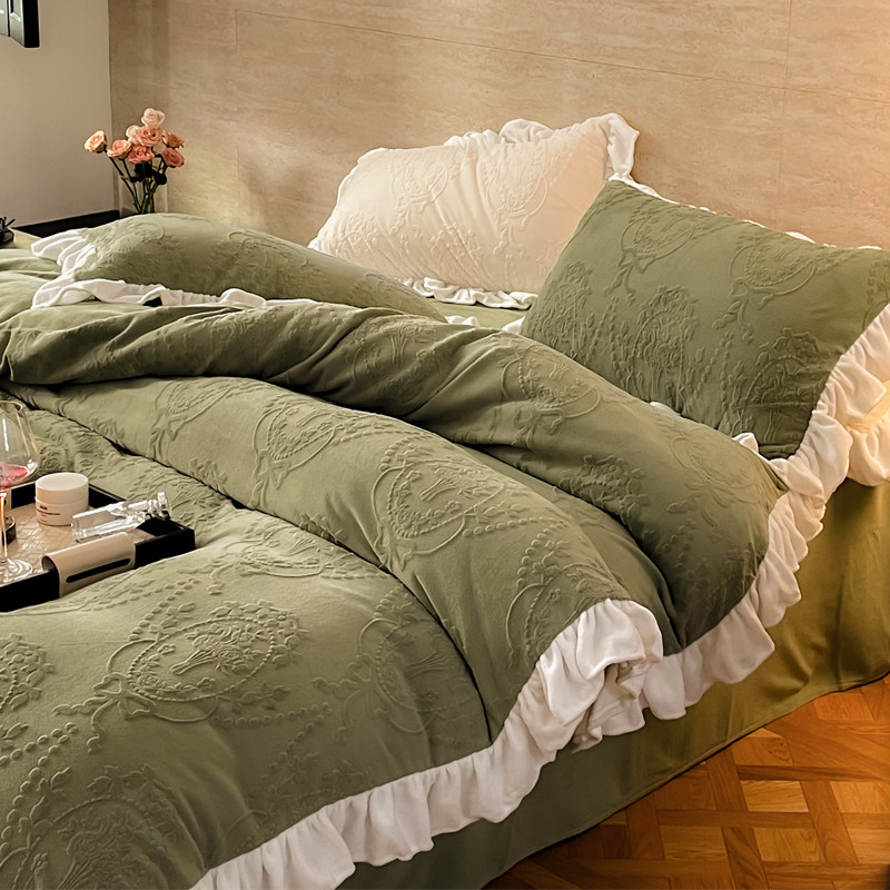 法式复古雕花牛奶绒四件套花边公主风秋冬加厚保暖珊瑚绒被套床单