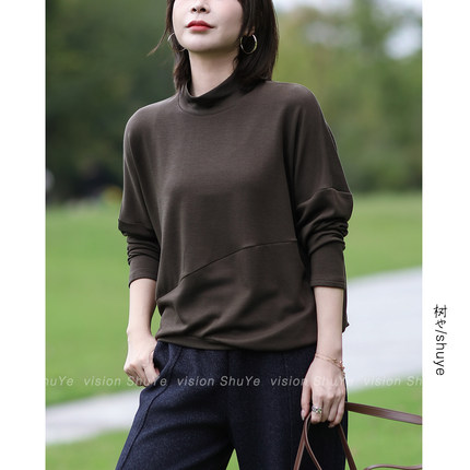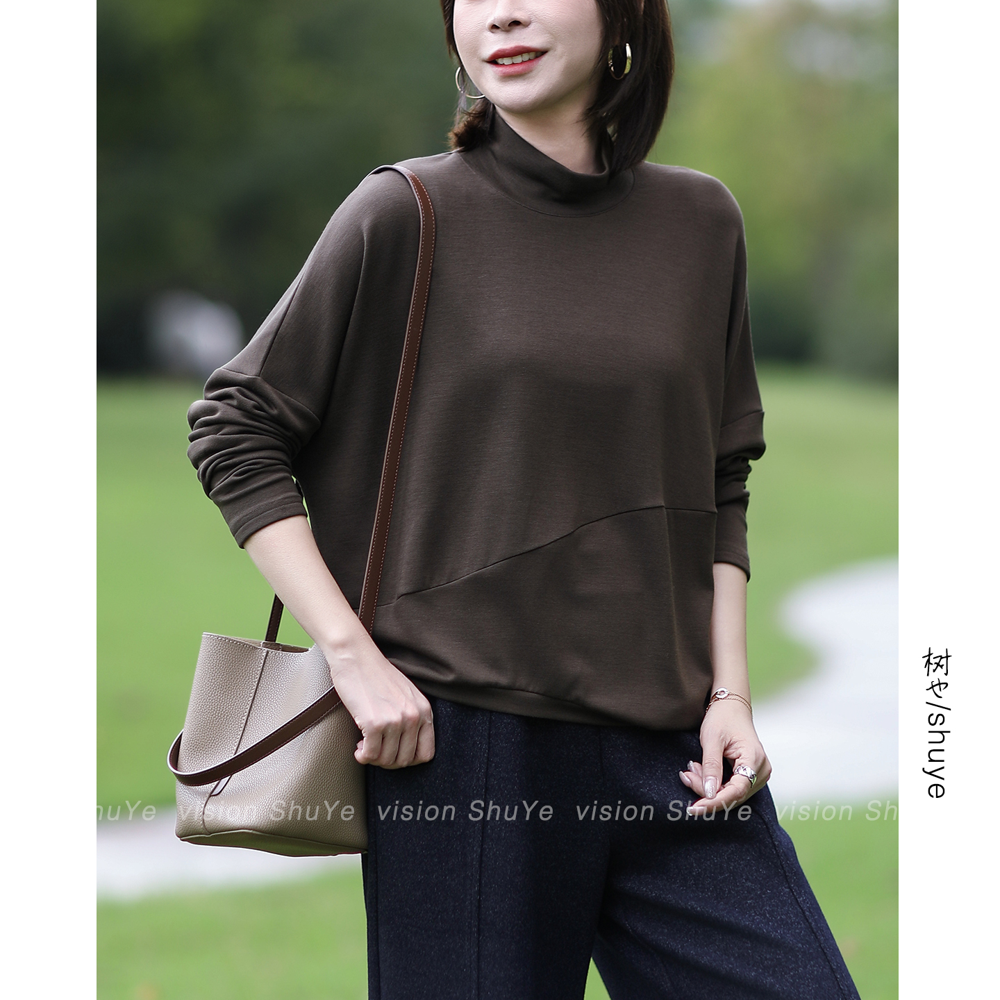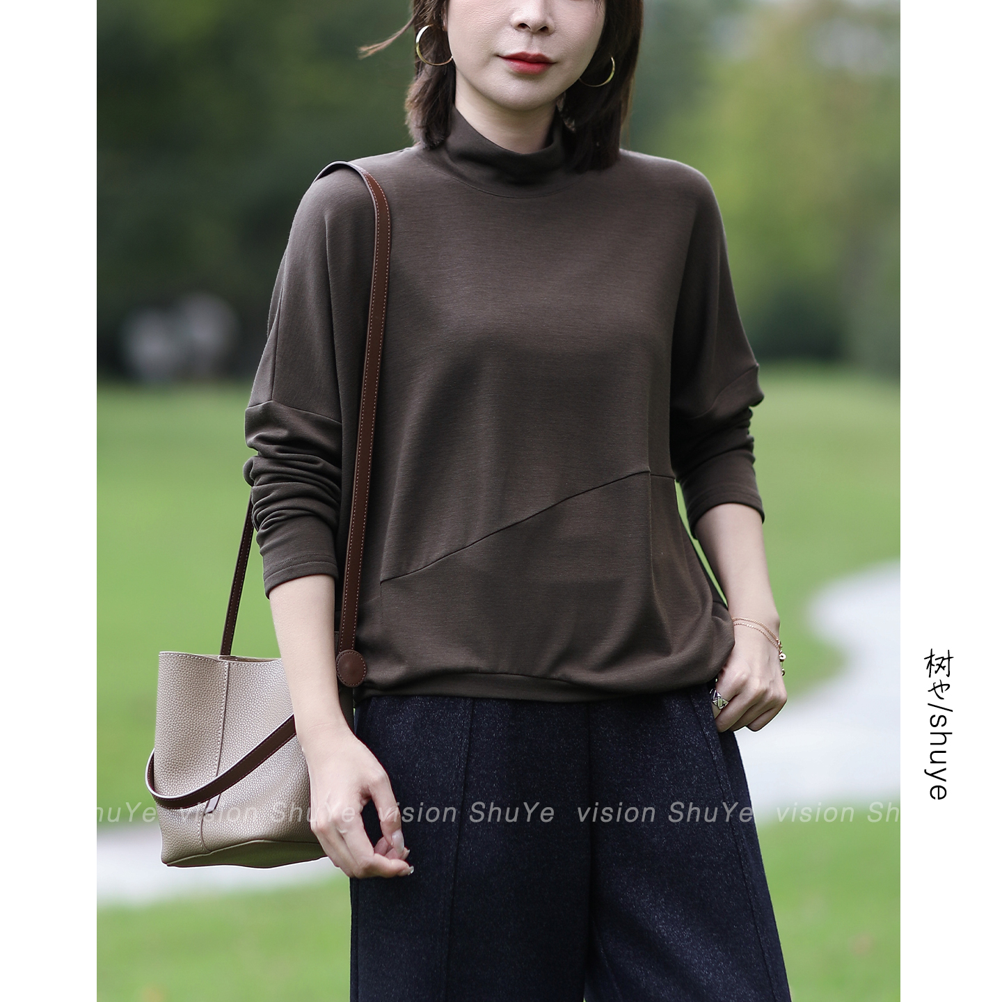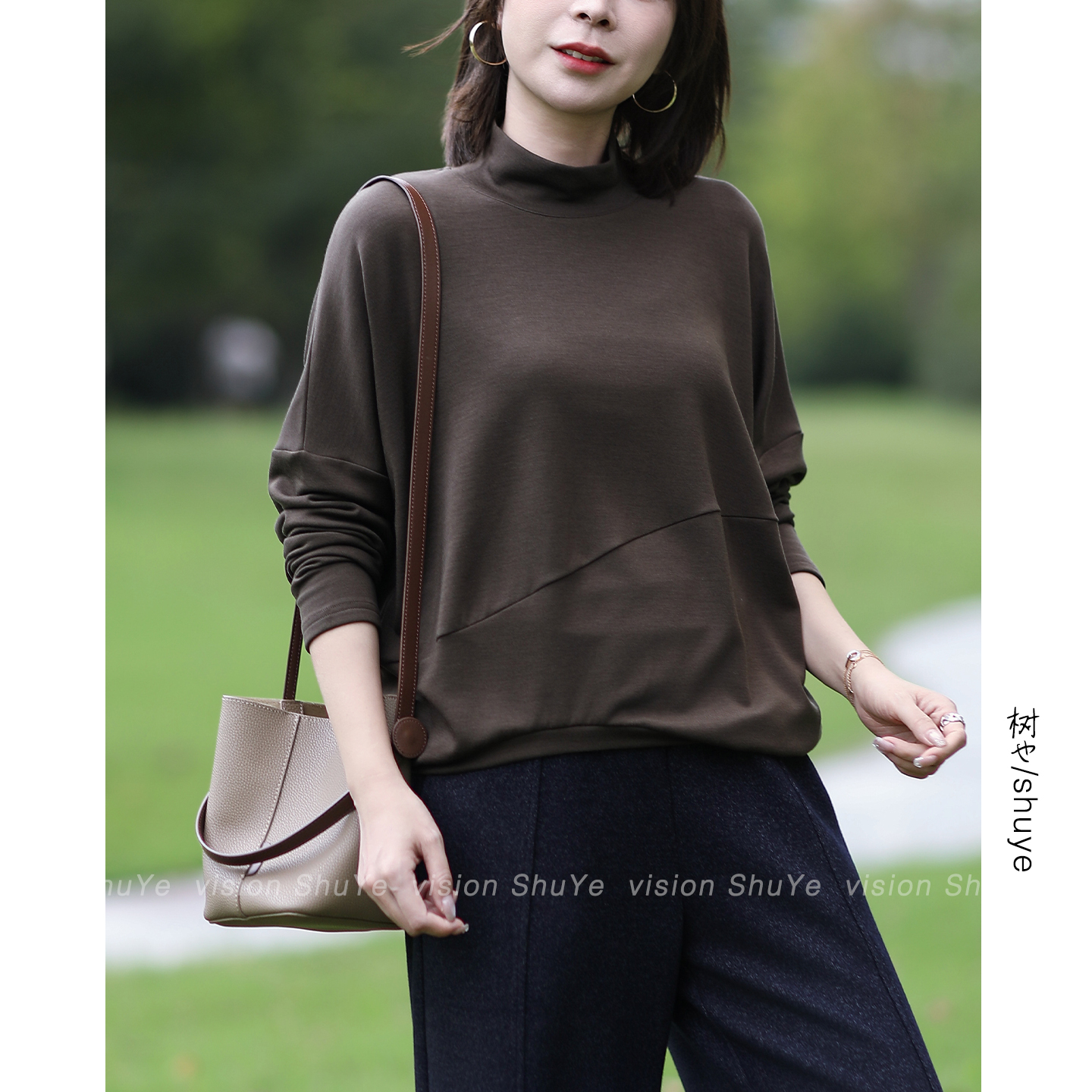 树也 原创设计 弧形下摆含天丝羊毛立领长袖打底衫女薄绒卫衣秋冬