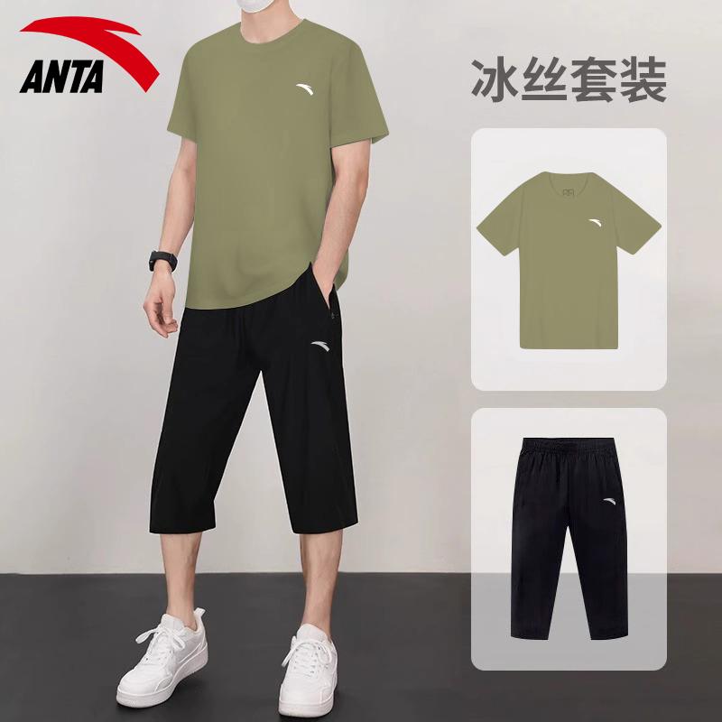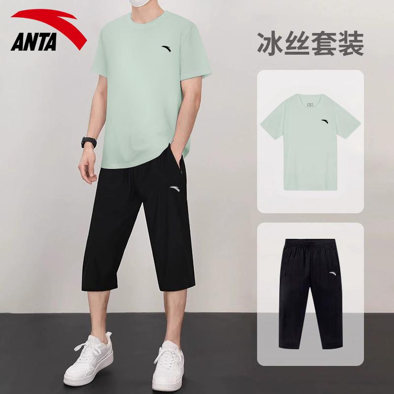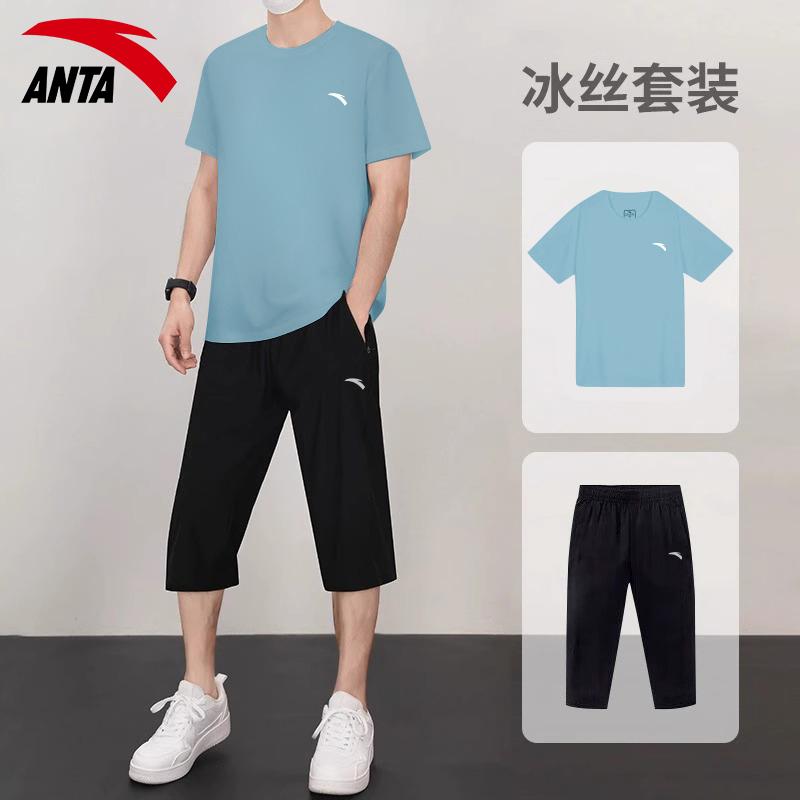 安踏运动套装男夏季新款冰丝速干衣套头短袖上衣七分裤训练两件套