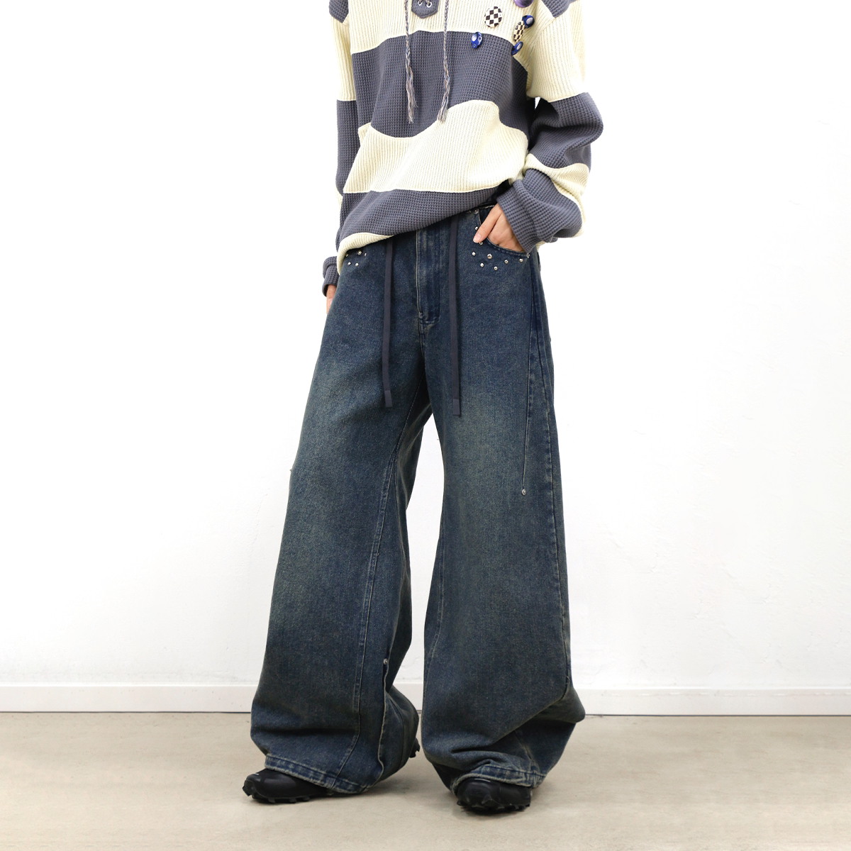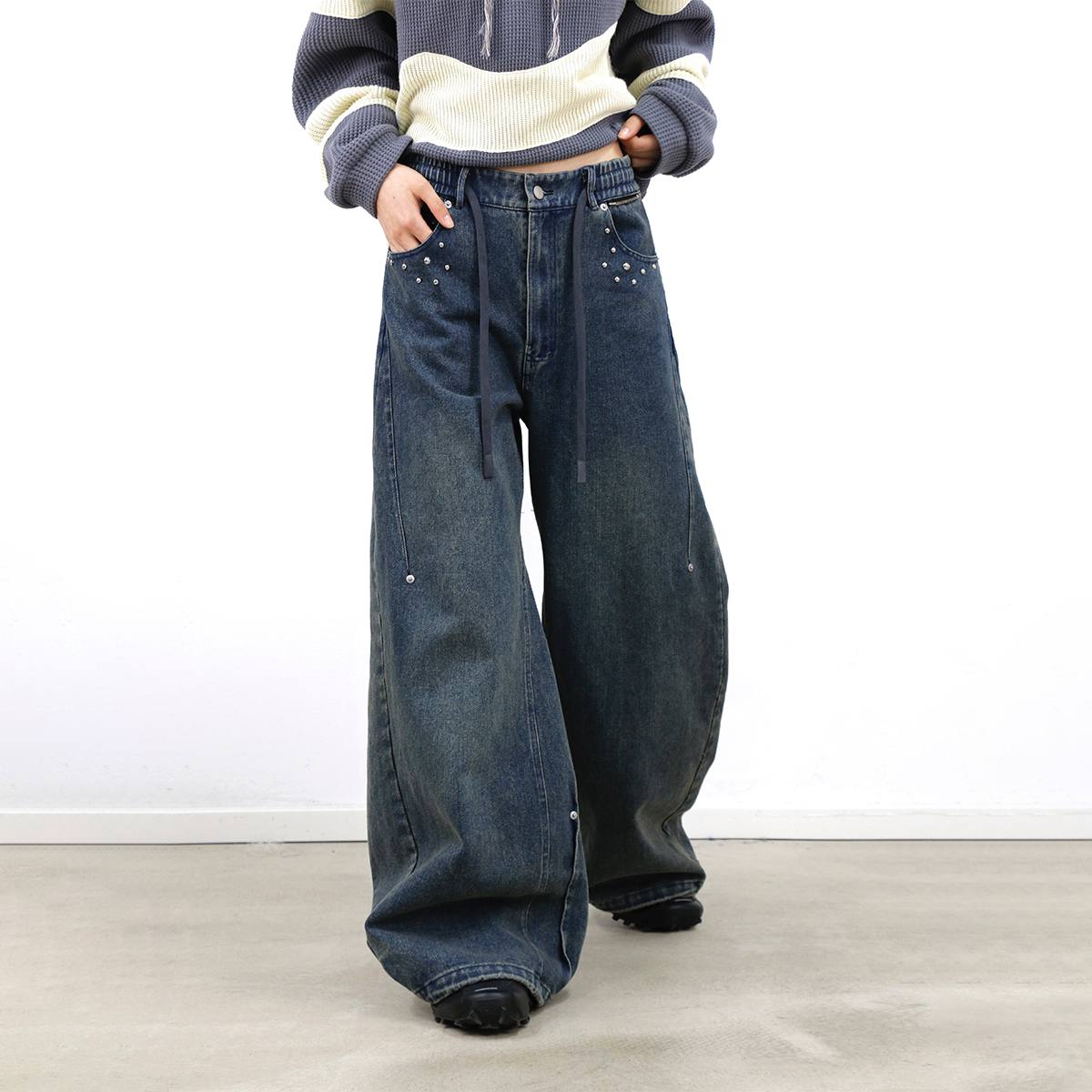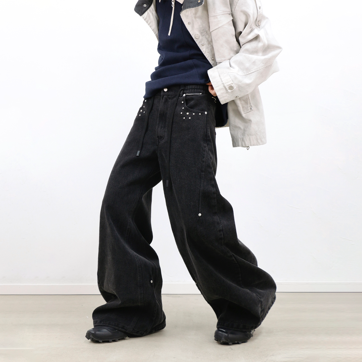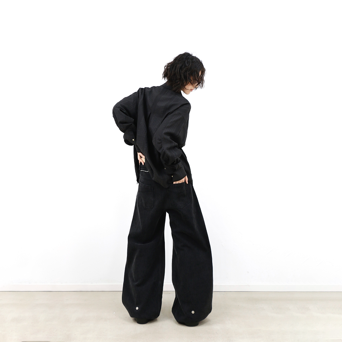RELABEL(虚廓)大开衩反向捏褶缓A字版型休闲微阔打褶水洗牛仔裤