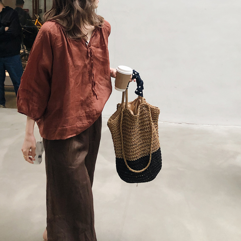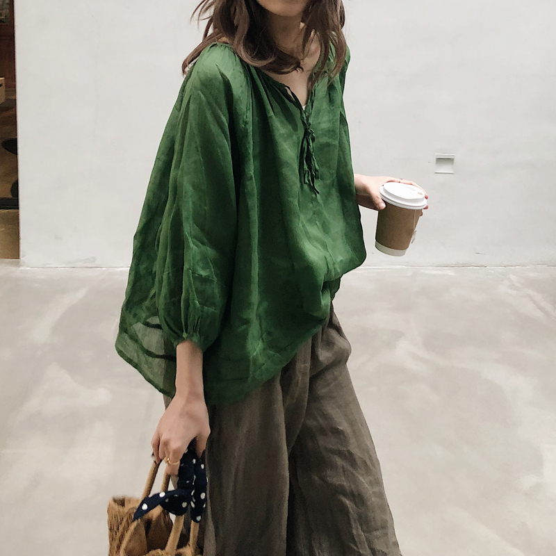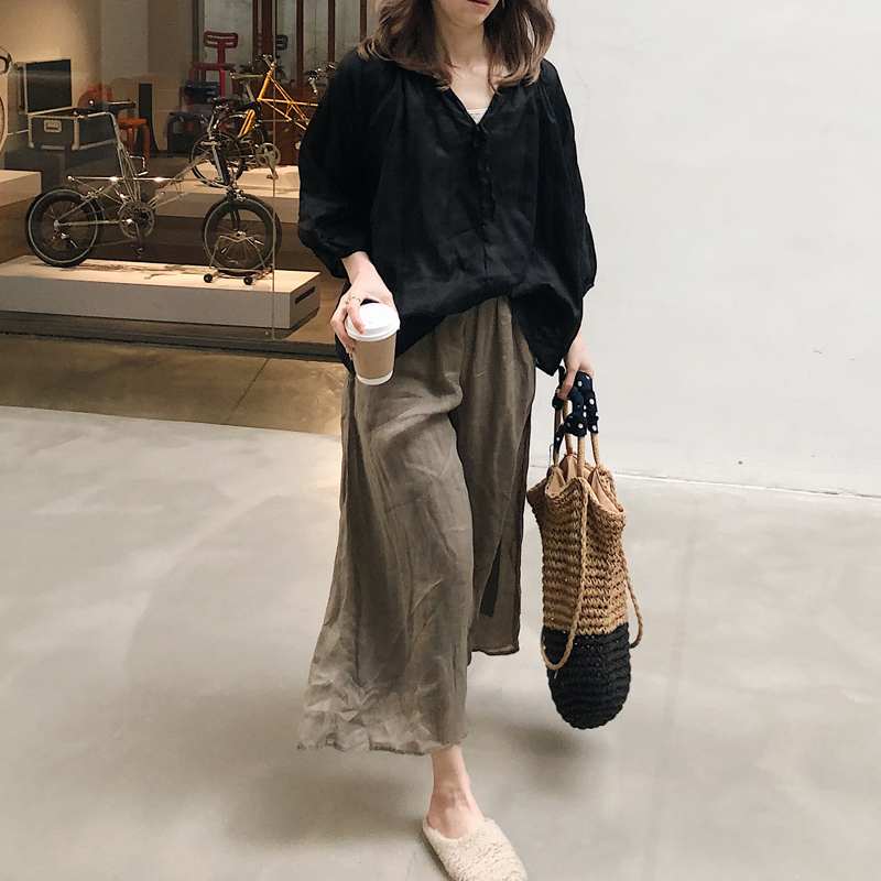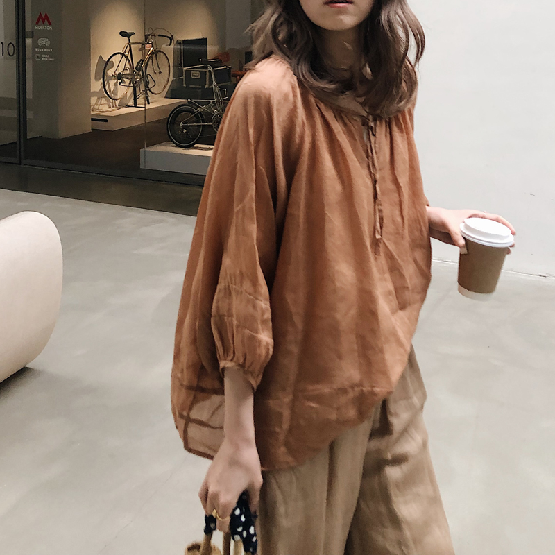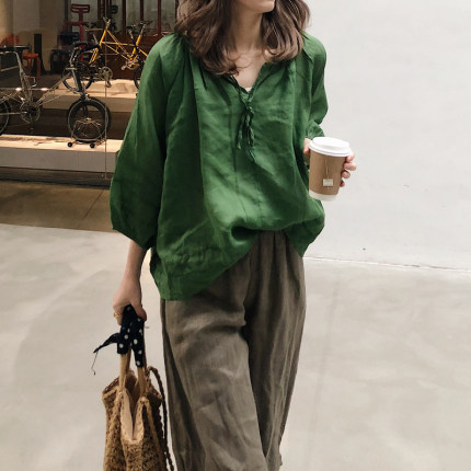 2025春夏新女 日系复古大码棉麻亚麻苎麻宽松显瘦套头灯笼袖衬衫