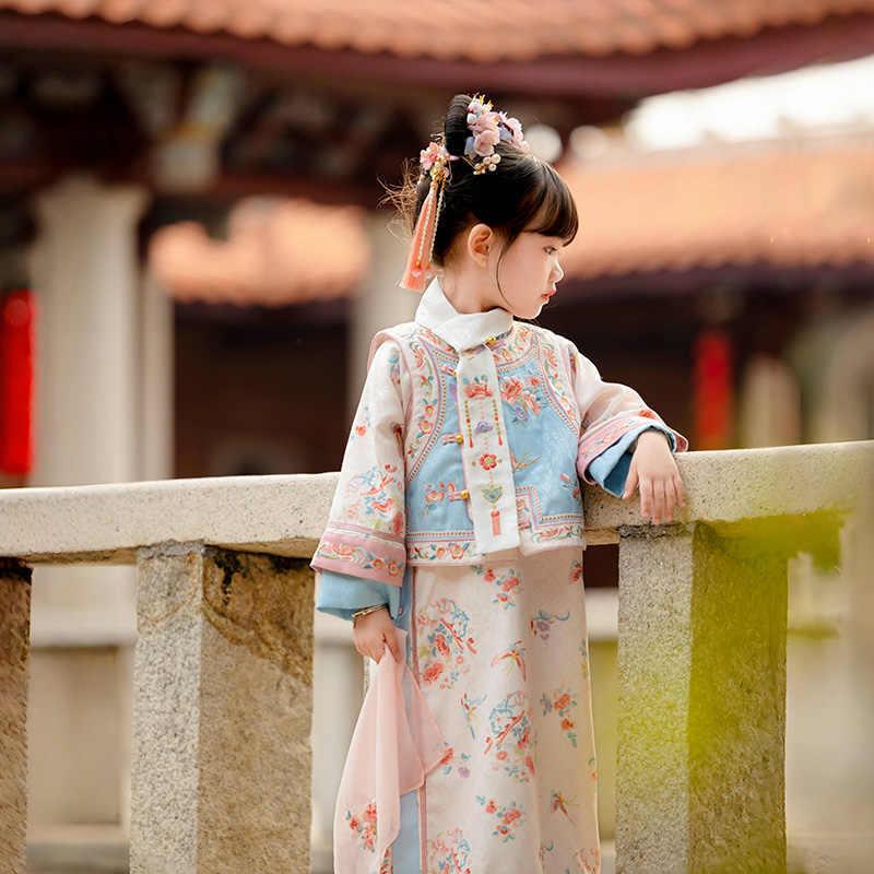 儿童粉色清朝格格服古装春秋女童满族民族服饰古风旗袍公主裙唐装
