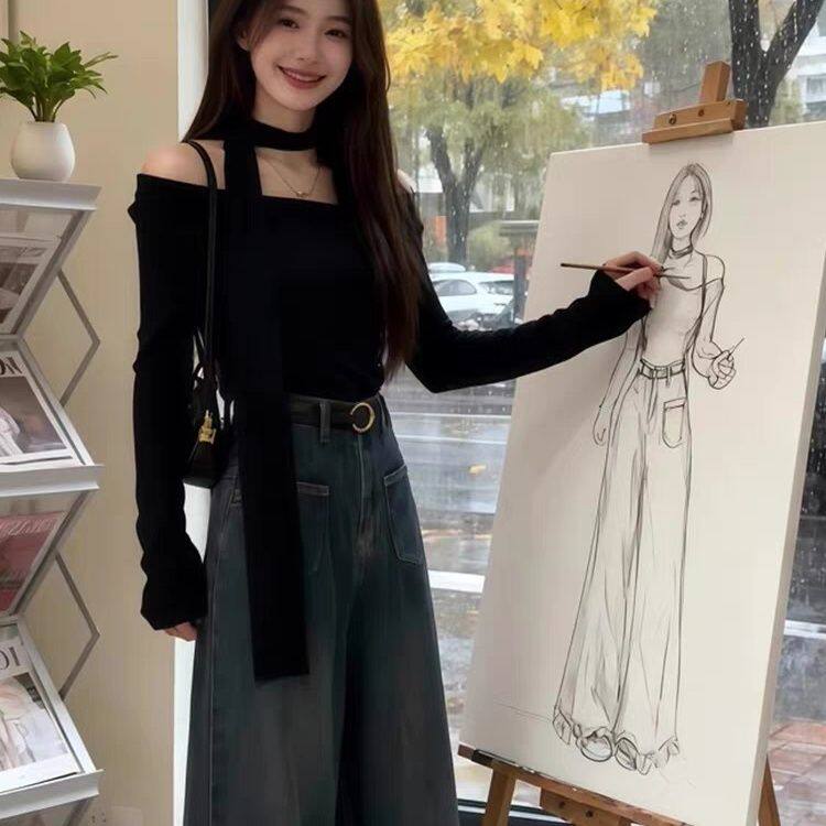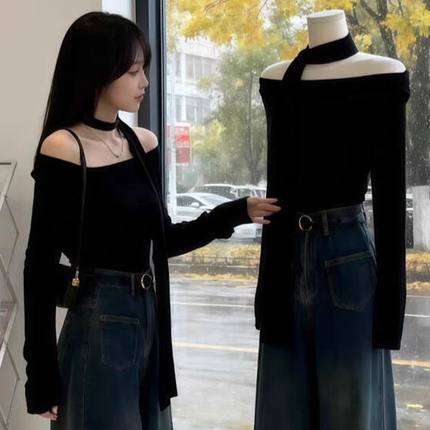 纯欲辣妹气质一字肩修身短上衣秋冬款挂脖飘带上衣潮