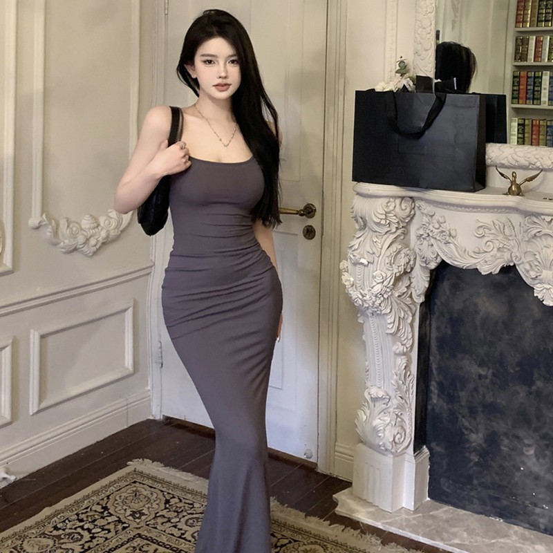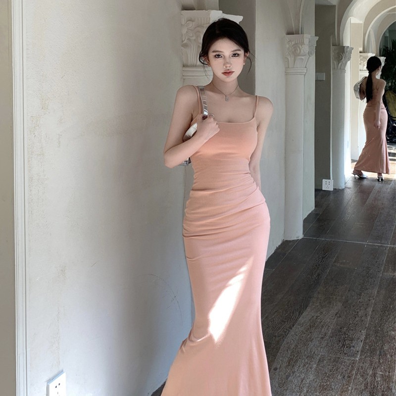 性感紧身吊带连衣裙女夏季纯欲风粉色修身鱼尾裙子显身材包臀长裙