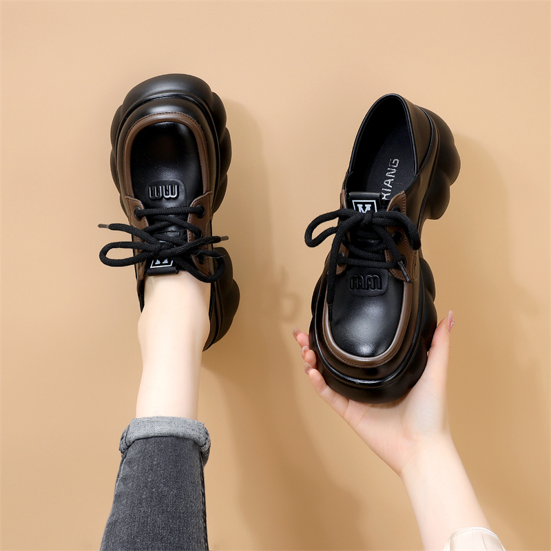 厚底拼色小皮鞋女欧货2025春新款系带英伦风百搭增高乐福鞋单鞋