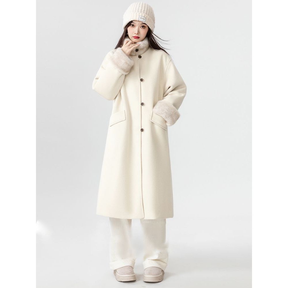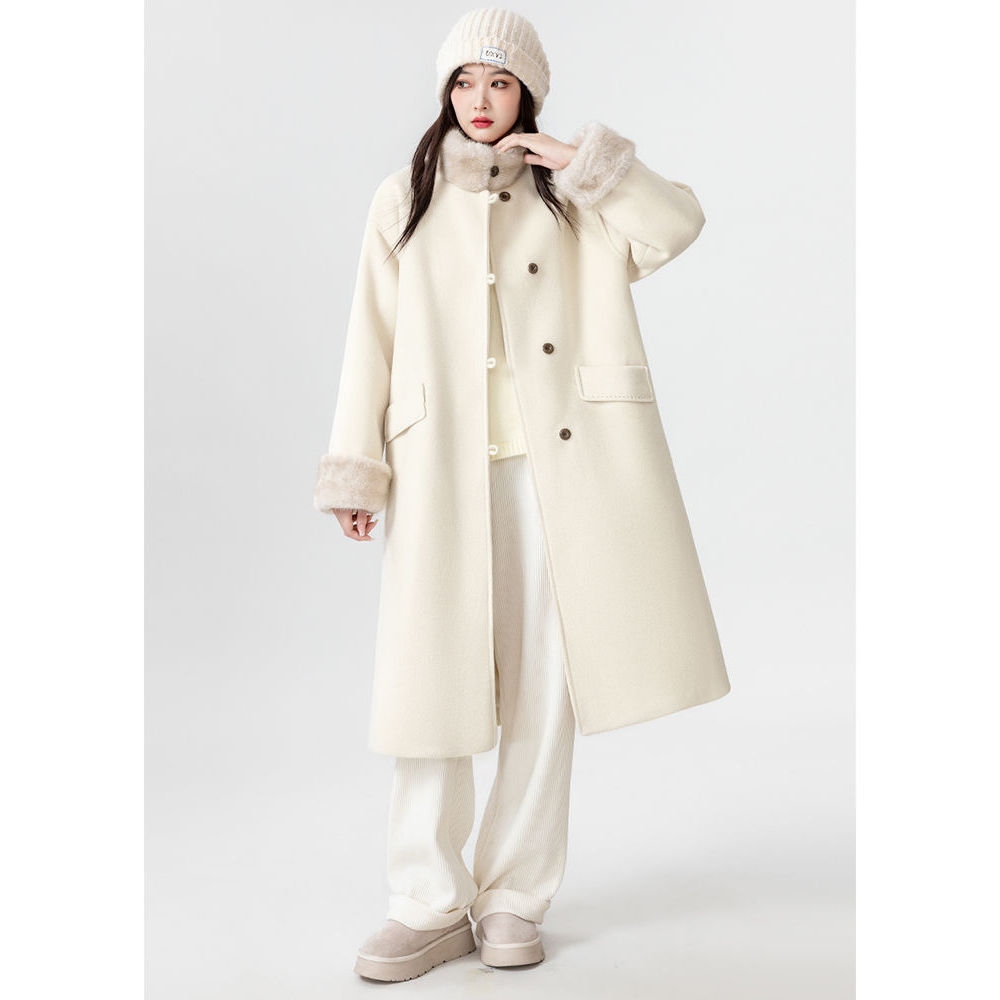 冬季新款米白色毛呢外套女时尚感气质简约加厚毛毛呢子大衣上衣