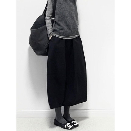 黑色毛呢花苞蓬蓬中长款a字伞裙