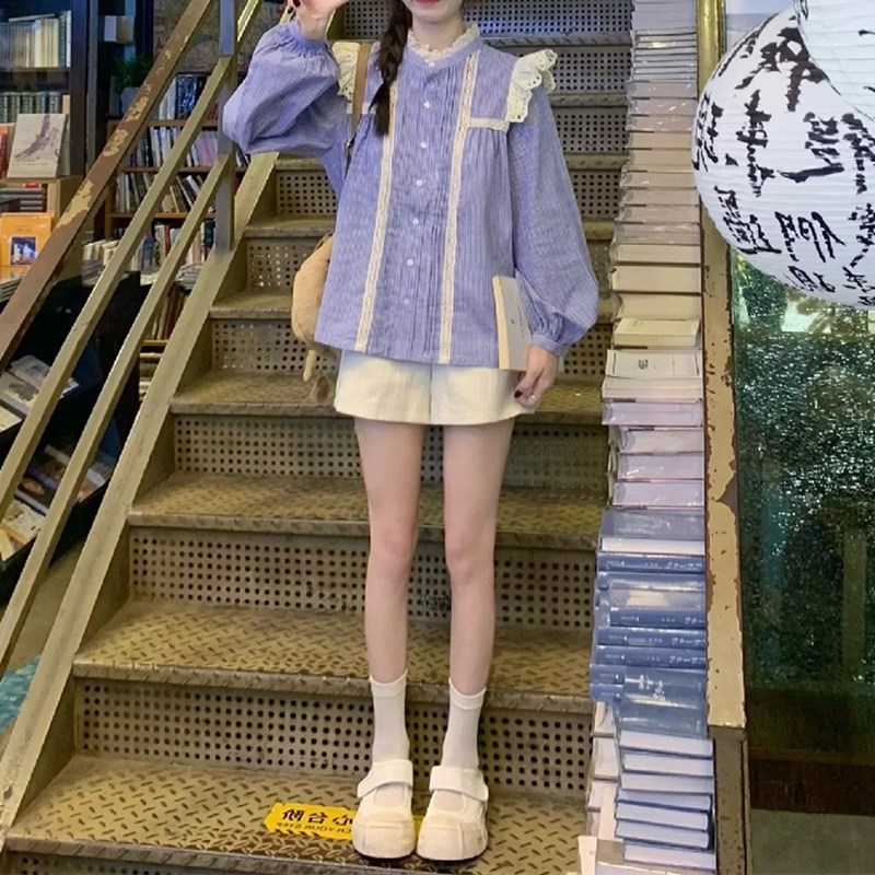 大码胖mm甜美复古蕾丝拼接宽松蓝色衬衫外套女秋显瘦百搭长袖上衣
