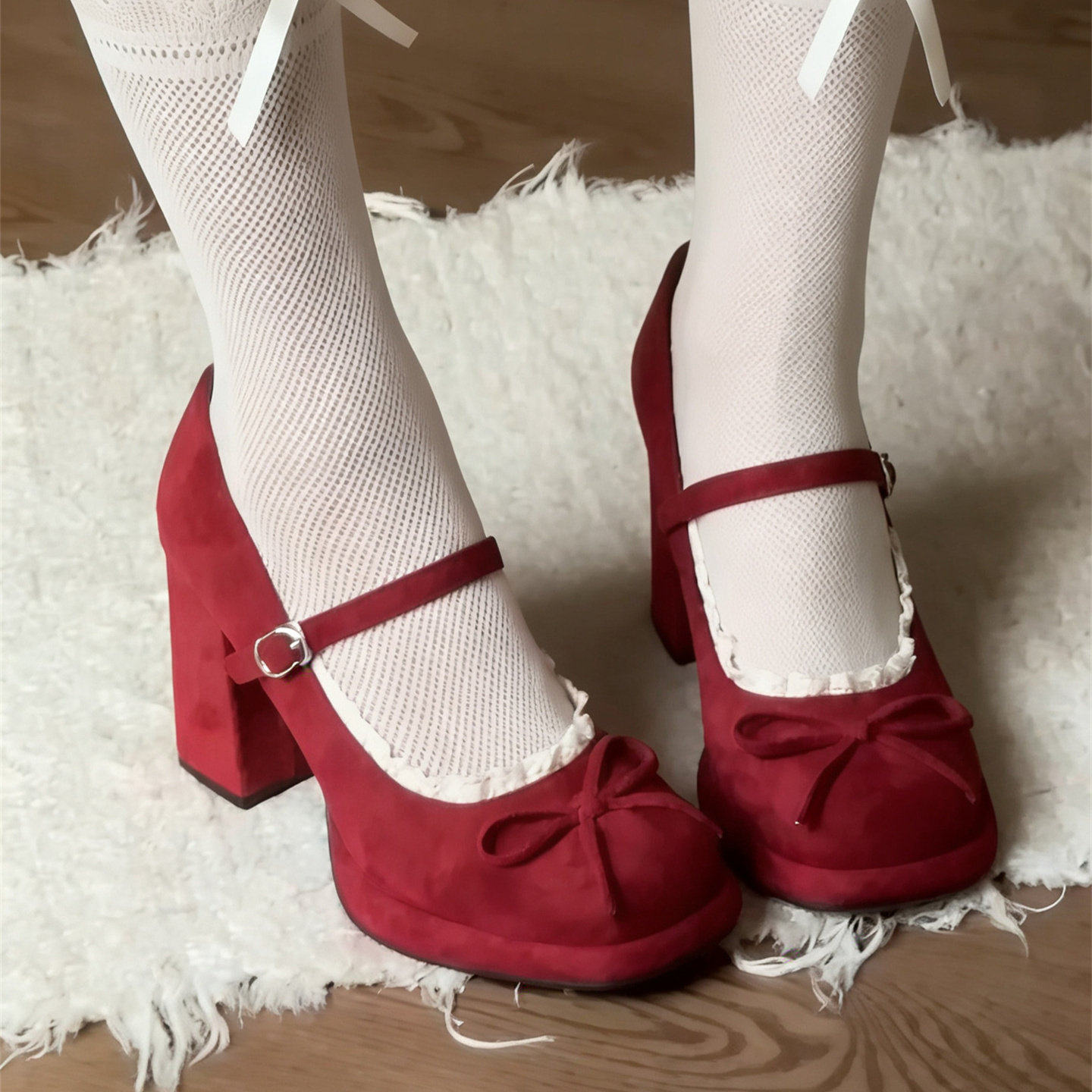 法式甜美风红色蝴蝶结玛丽珍鞋女2026新款粗跟高跟一字带浅口单鞋
