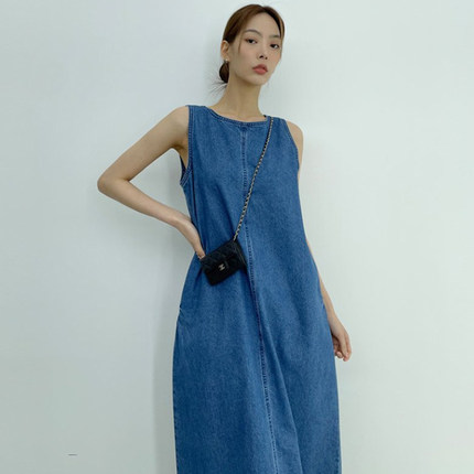 韩国chic夏季复古小众圆领宽松休闲纯色无袖背心牛仔连衣裙长裙女