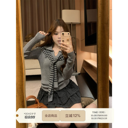 DDXZ夕子韩系学院风POLO领套头上衣条纹披肩小马刺绣长袖针织衫女