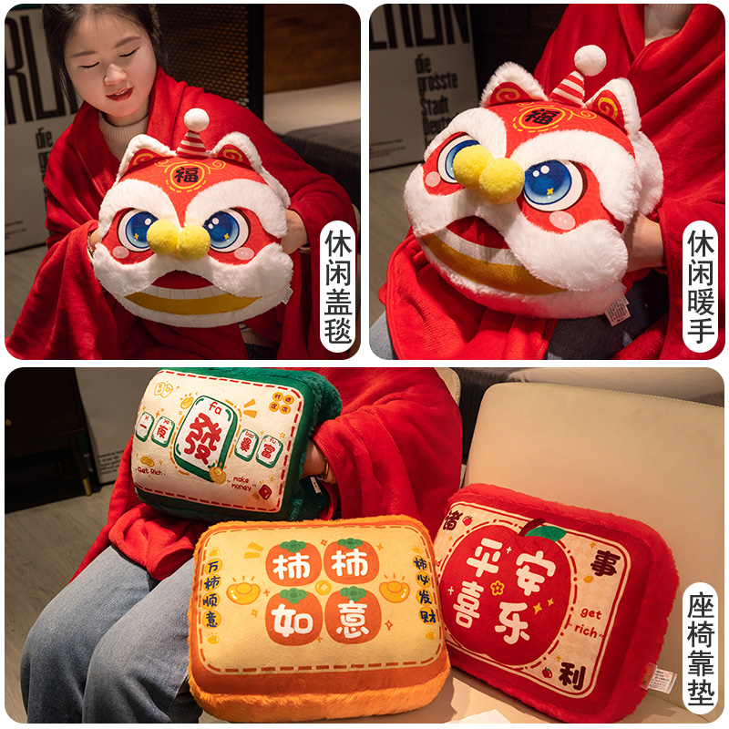 2025国潮醒狮抱枕公仔客厅沙发靠垫蛇年吉祥物抱枕毯子二合一定制