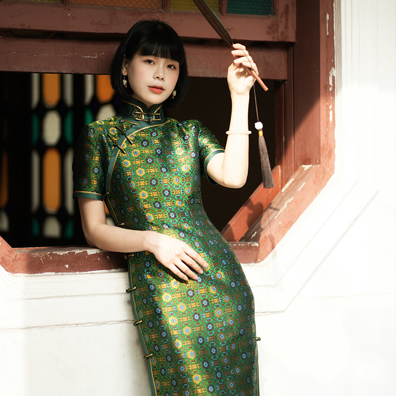 三重门青瓷雅韵45姆米非遗宋锦织金桑蚕丝长款旗袍礼服高级感女士