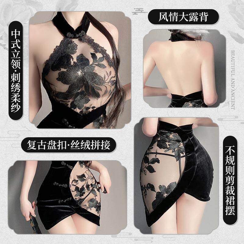 新中式旗袍性感纯欲睡裙女款辣妹紧身包臀裙复古刺绣丝绒透视内衣