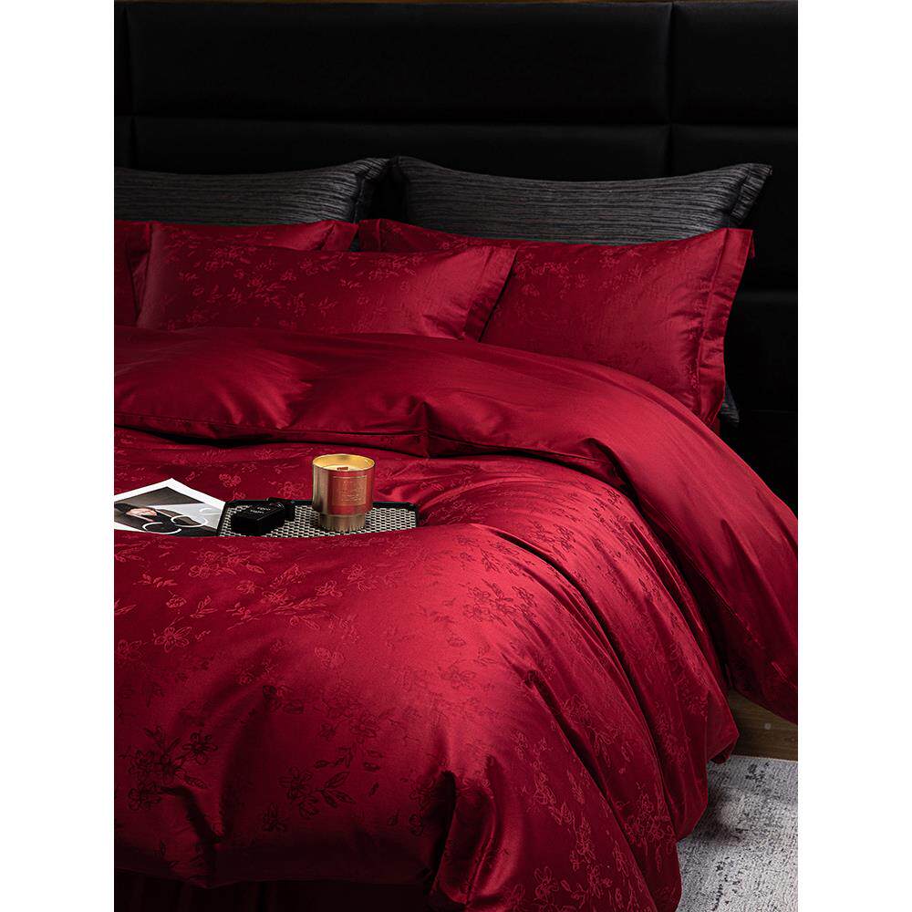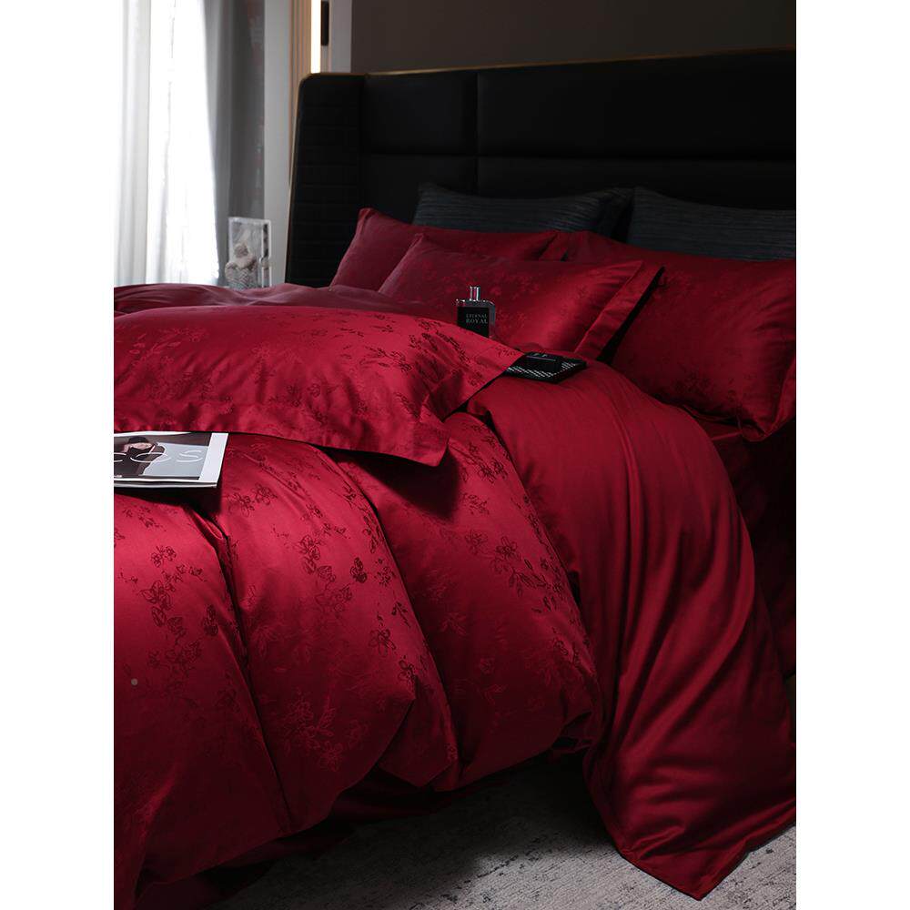 轻奢风婚庆四结件套0红0S长绒1棉提花被108套酒色纯棉床单婚床上