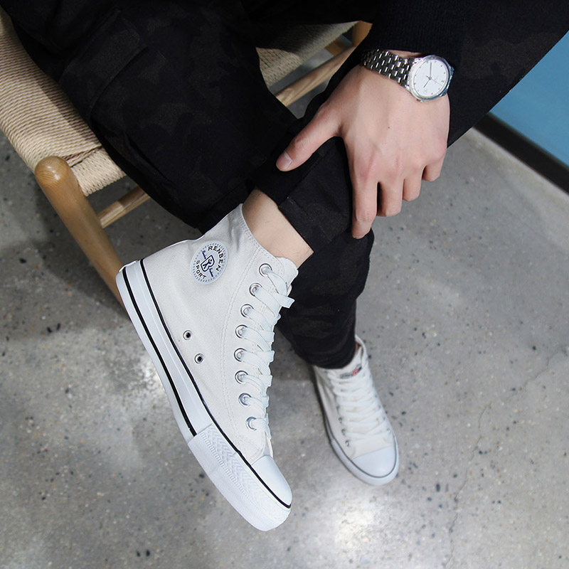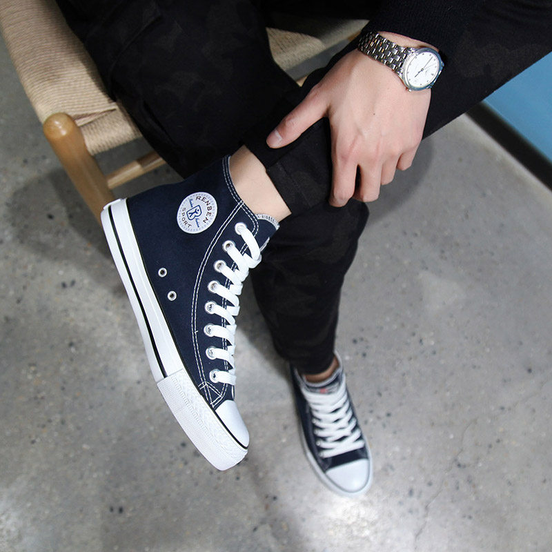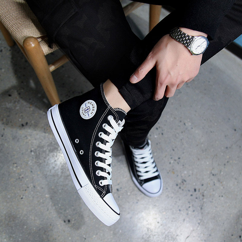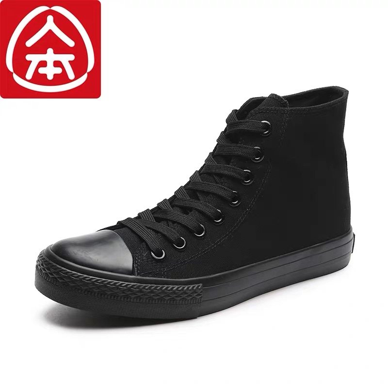 人本全黑色工作鞋高帮帆布鞋男高邦小黑鞋潮百搭学生板鞋纯黑布鞋