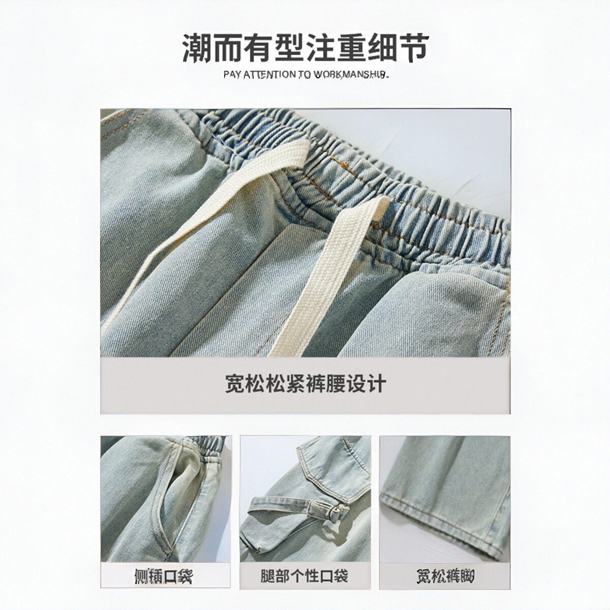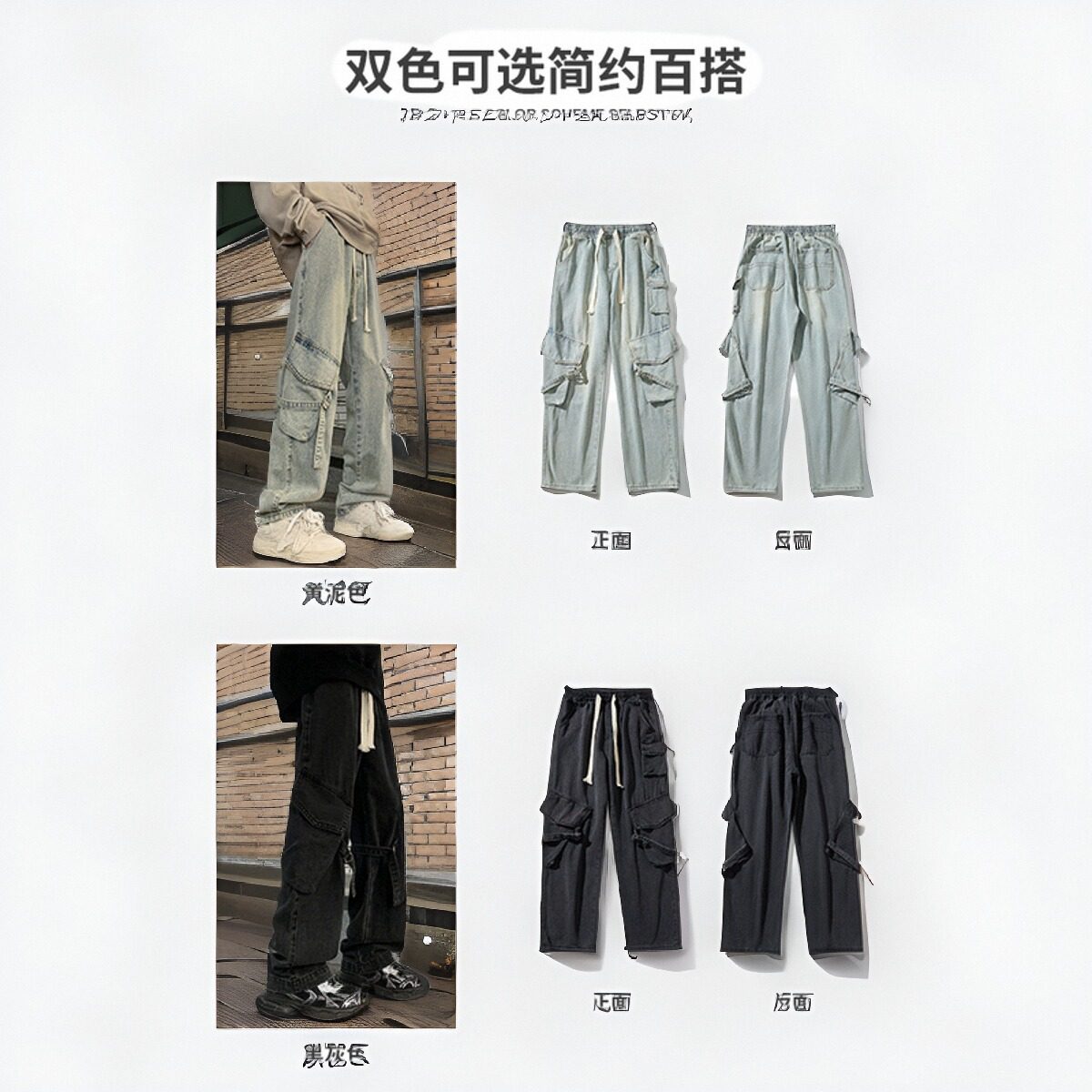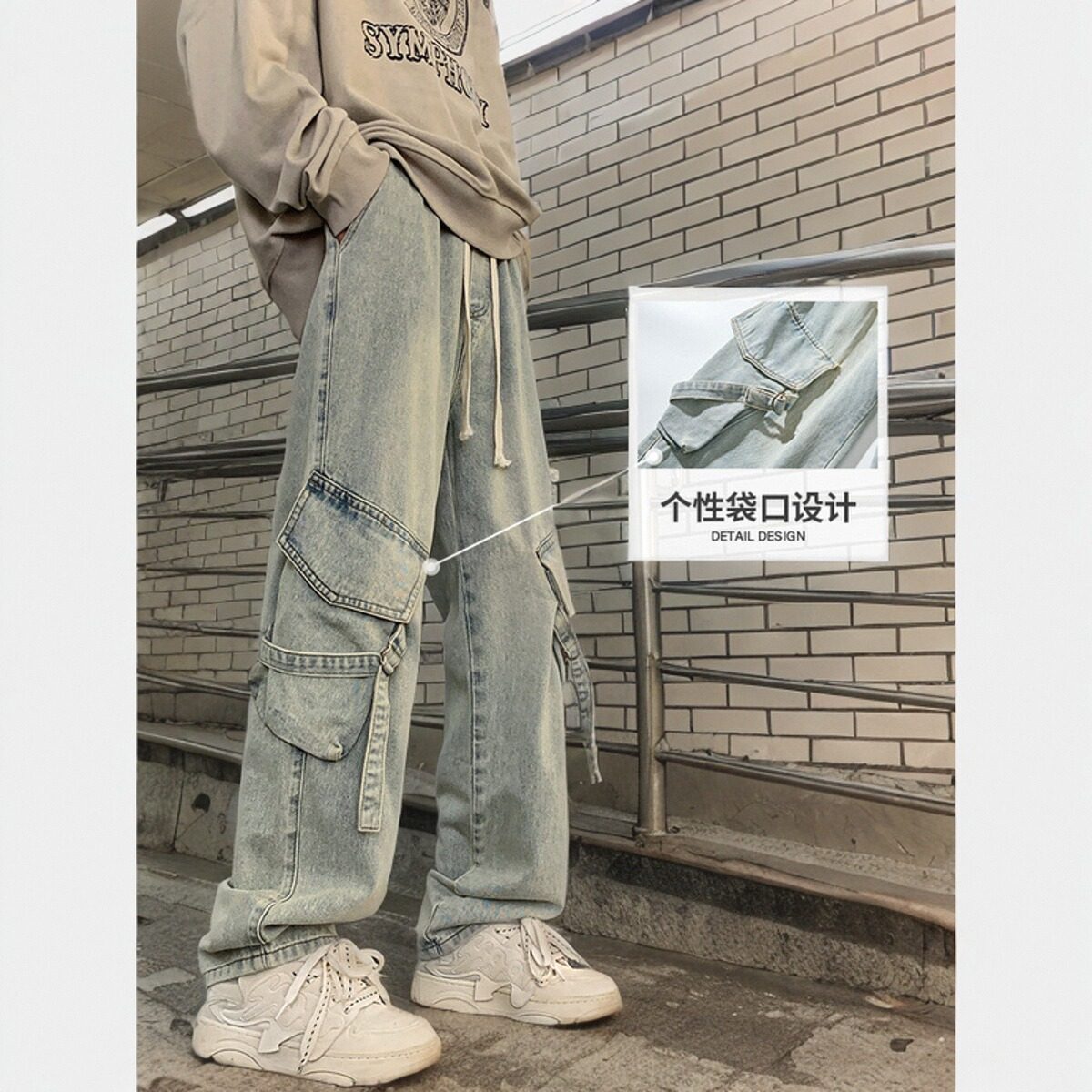 美式高街多口袋工装牛仔裤男春秋夏季薄款宽松直筒阔腿男生长裤子