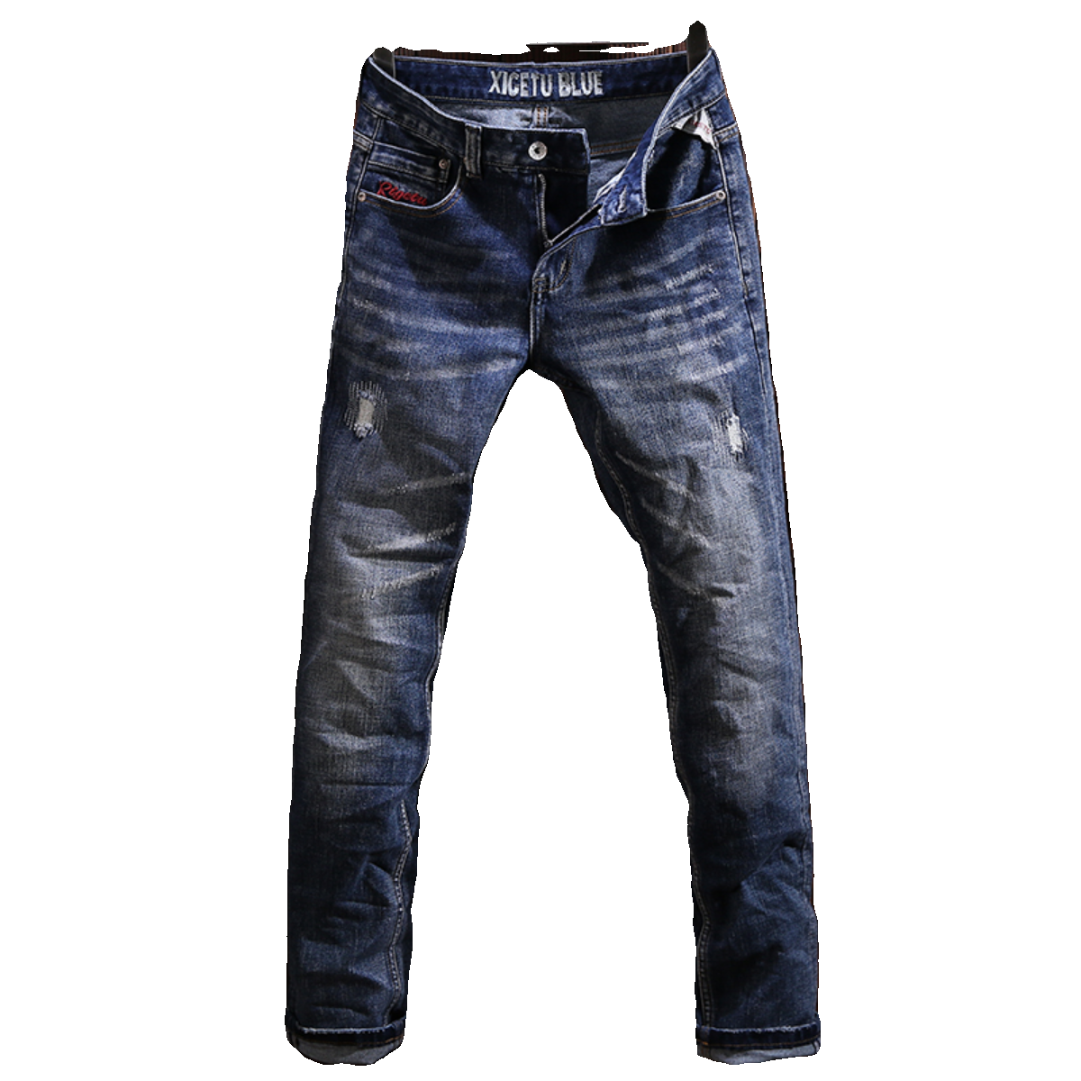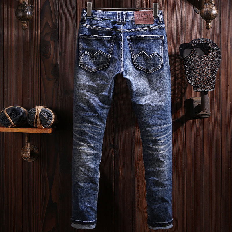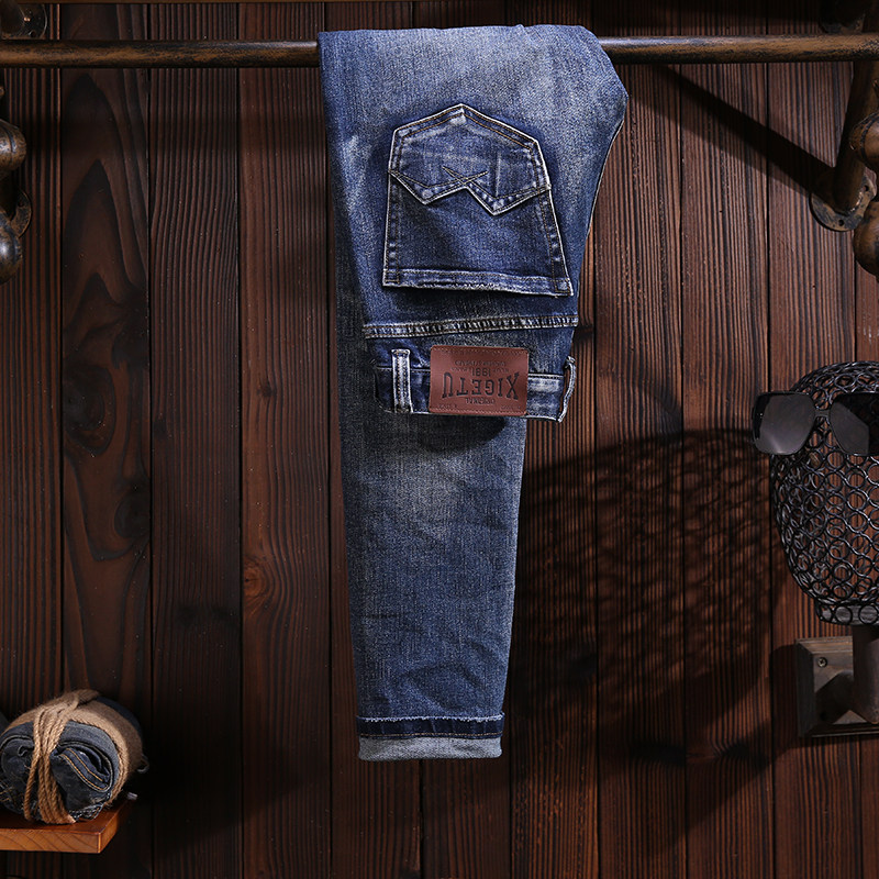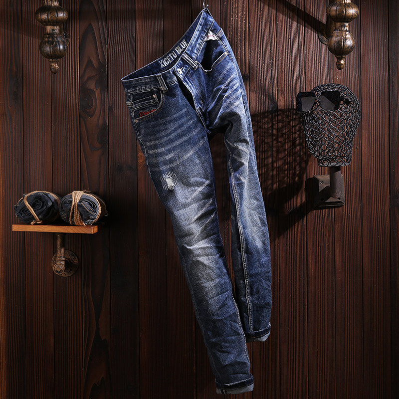 春夏新款潮牌破洞补丁修身小直筒牛仔裤男猫须蓝色水洗小脚长裤子