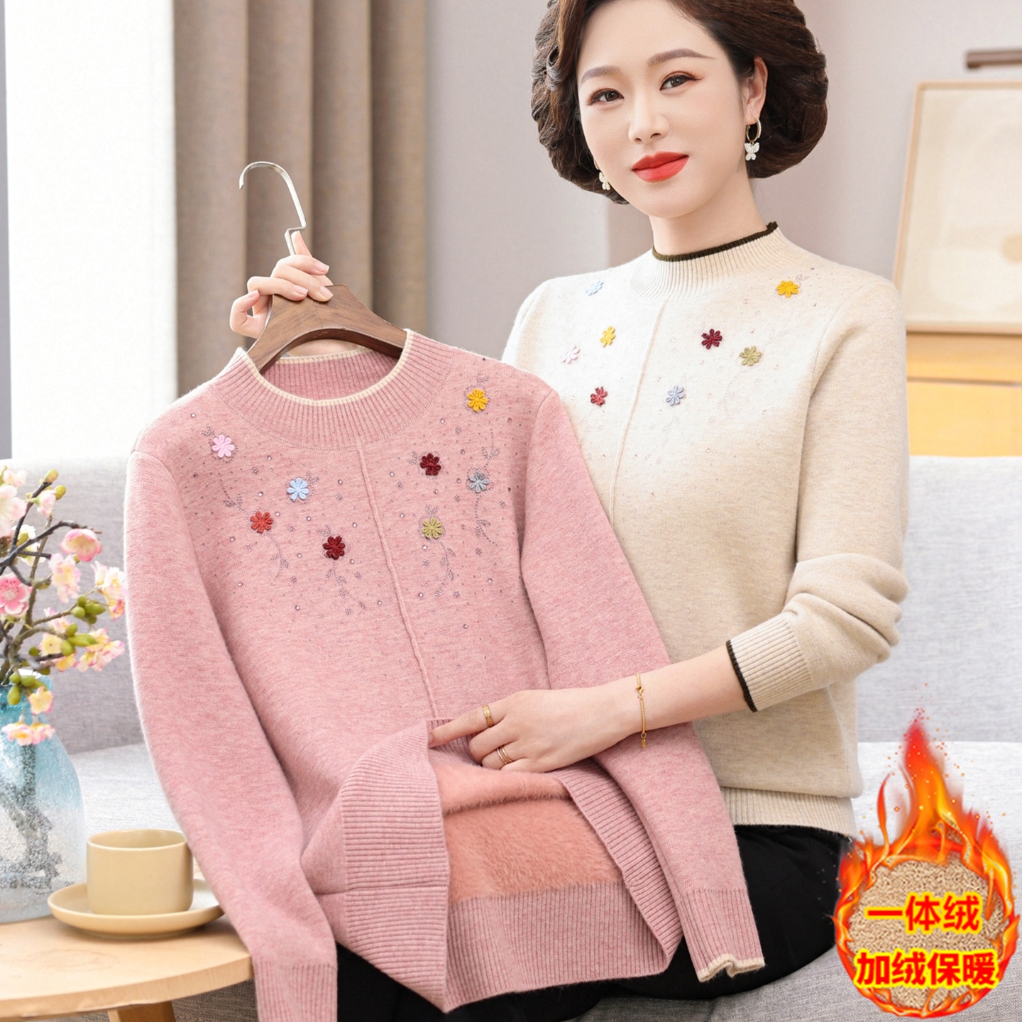 妈妈冬装半高领加绒加厚大码宽松打底衫中老年保暖衣内搭女士毛衫