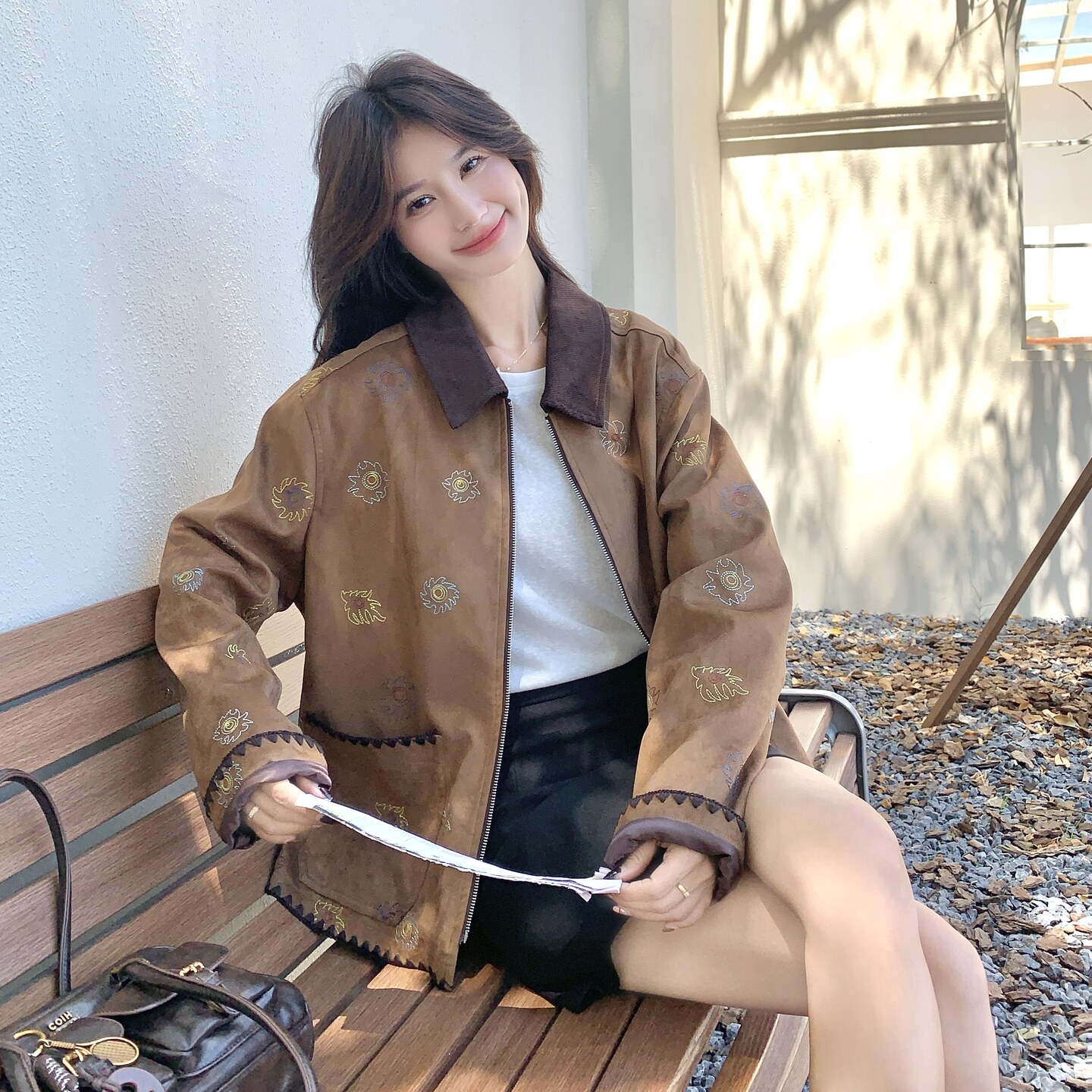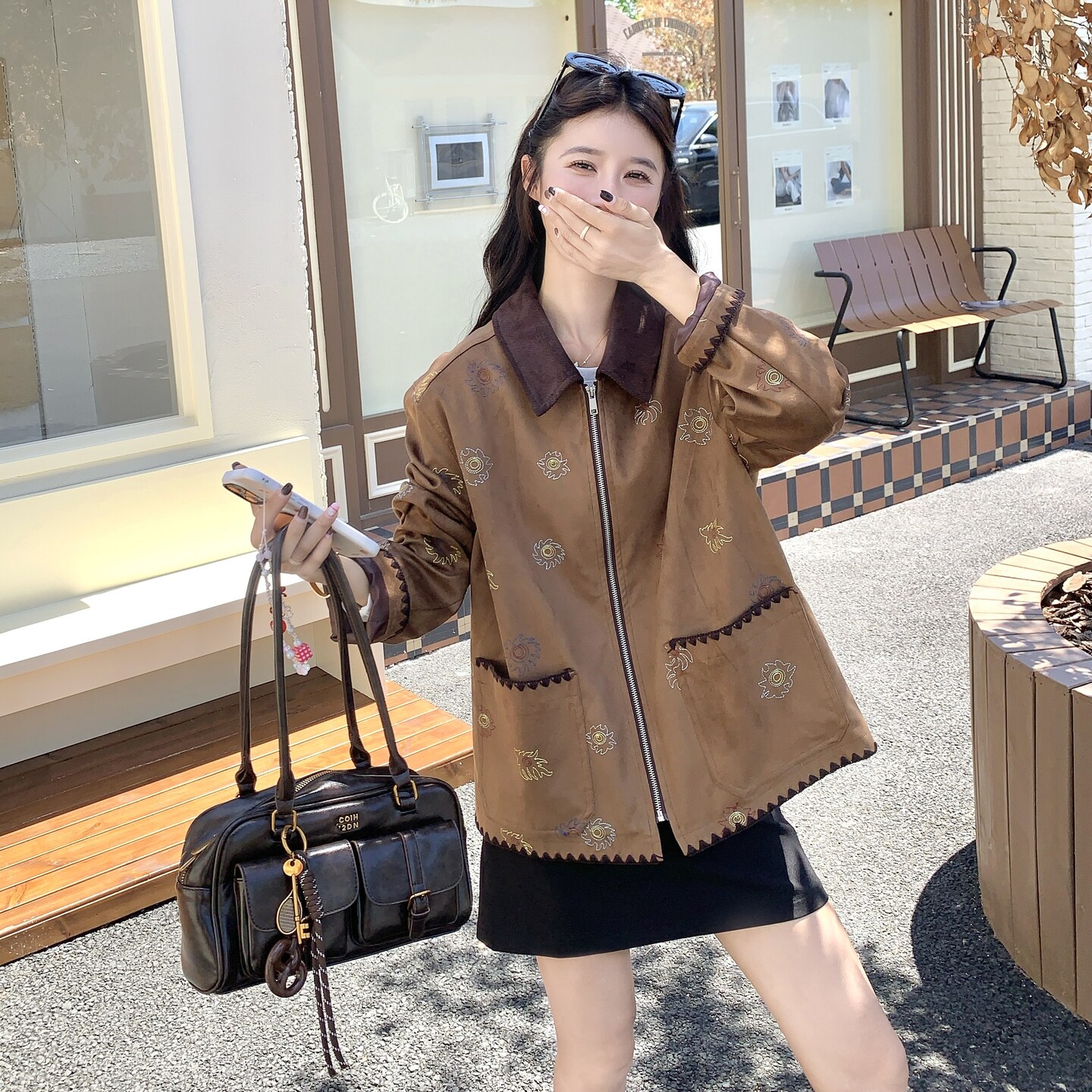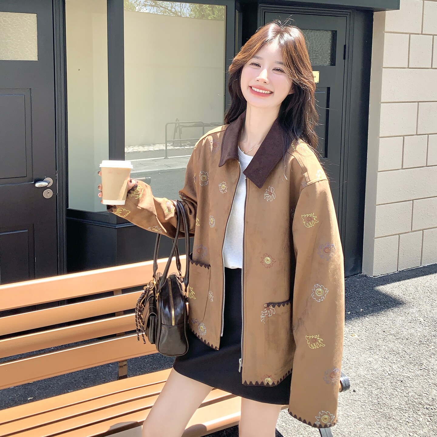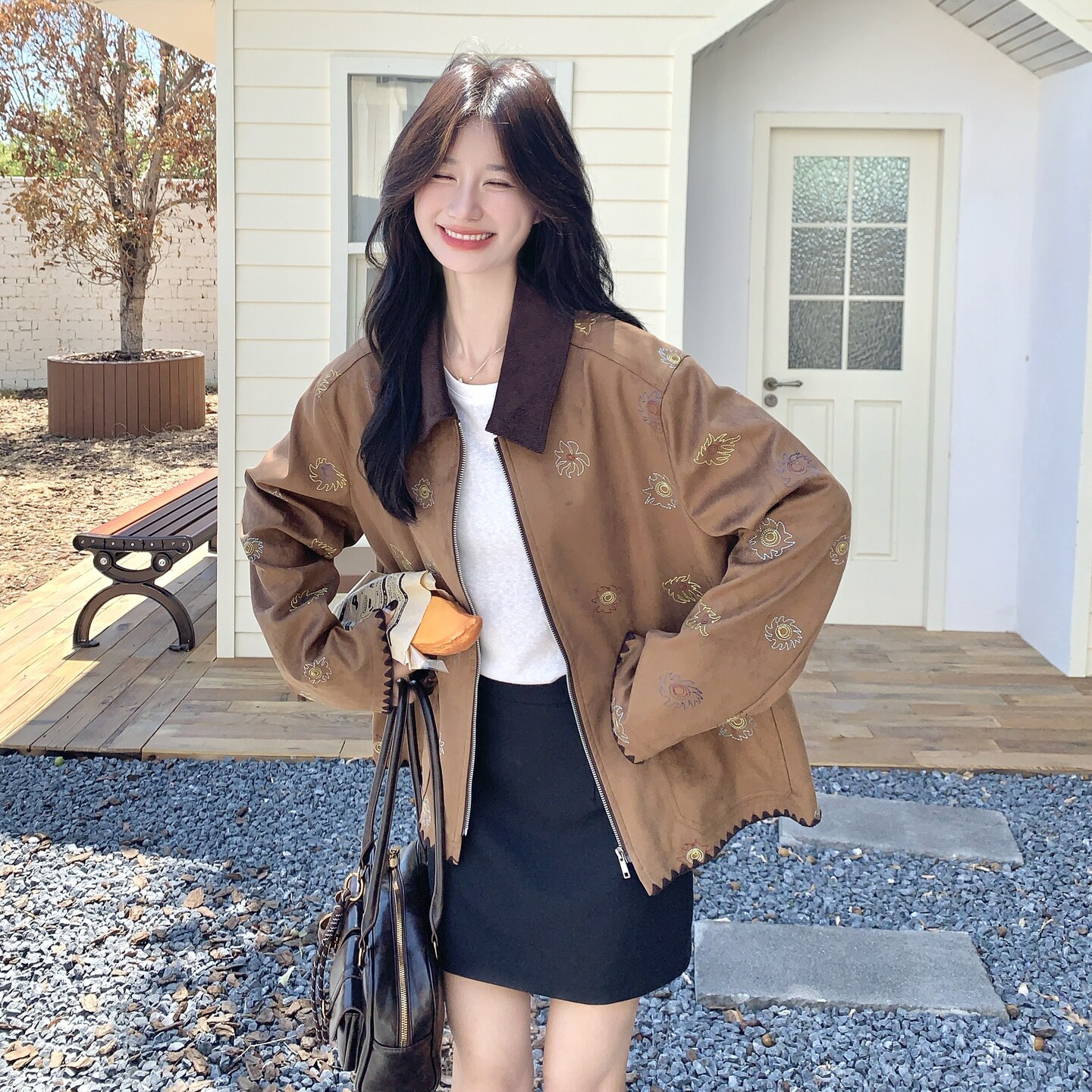 棕色美拉德复古时髦外套女2026年春季新款甜酷减龄麂皮绒刺绣夹克