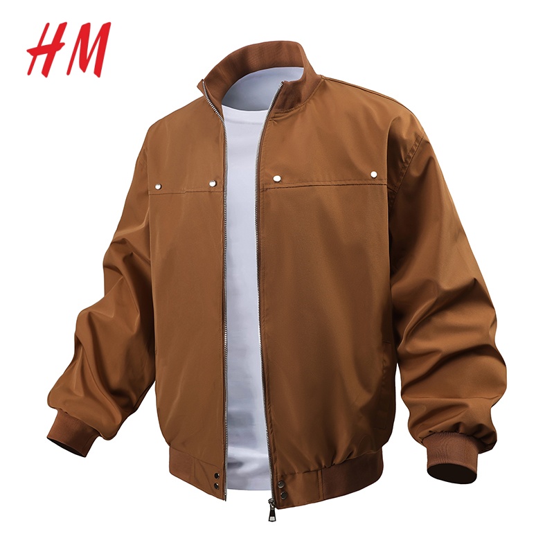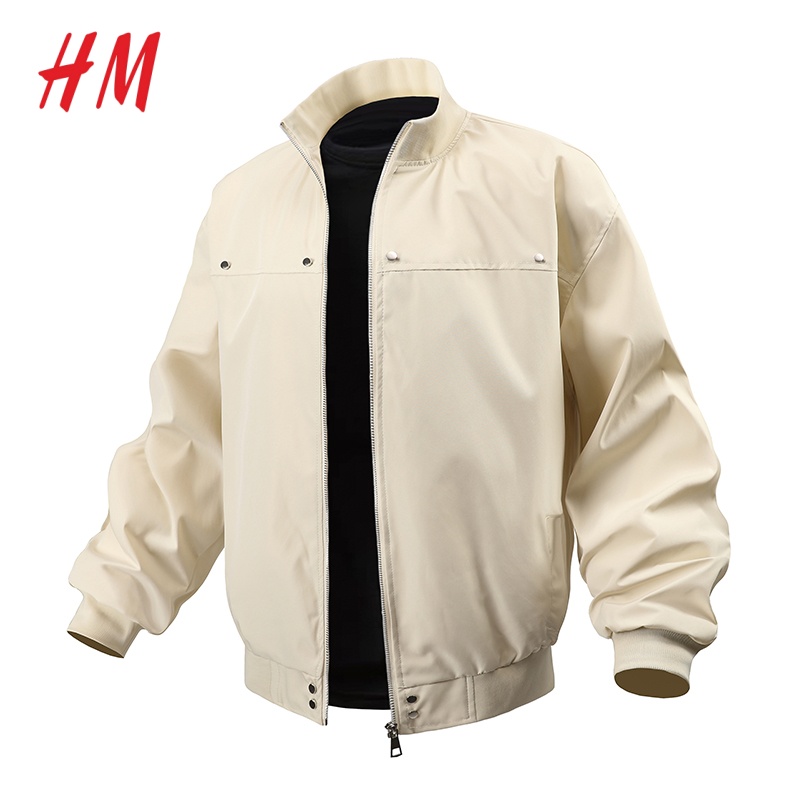HM美式复古夹克外套男士春秋新款宽松立领棒球服纯色休闲百搭外套