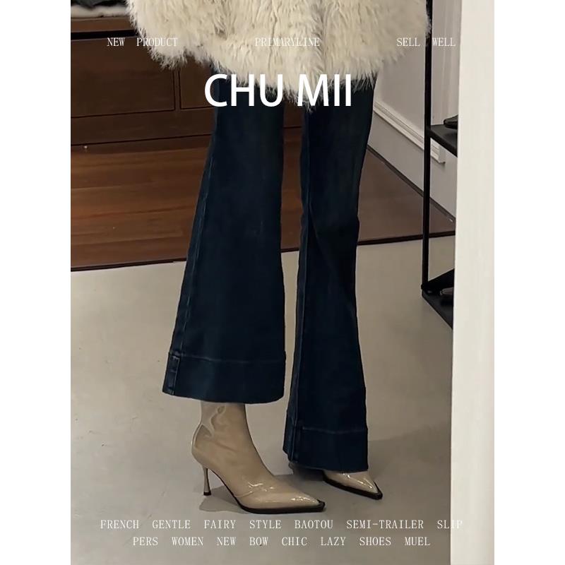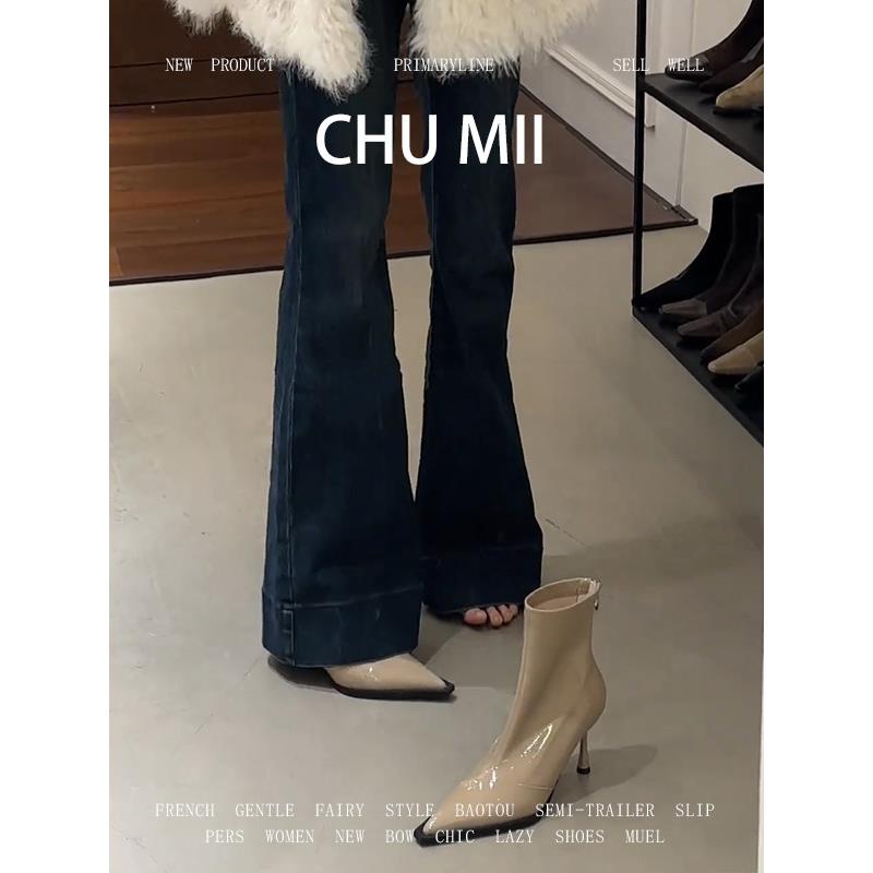 奶茶色覆古高跟尖头短靴女秋冬百搭漆皮细跟弹力瘦瘦靴裸靴
