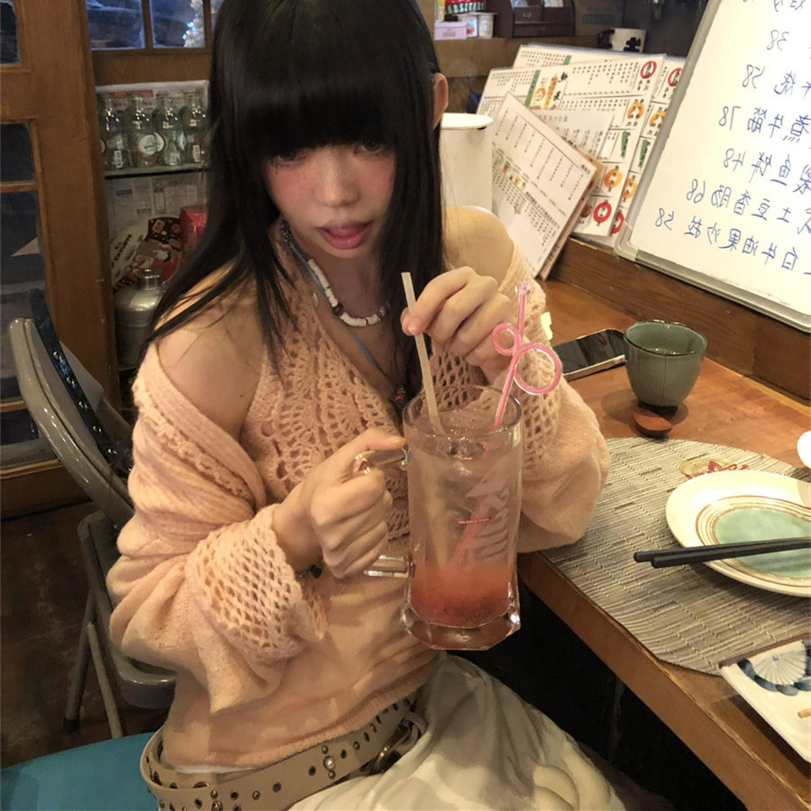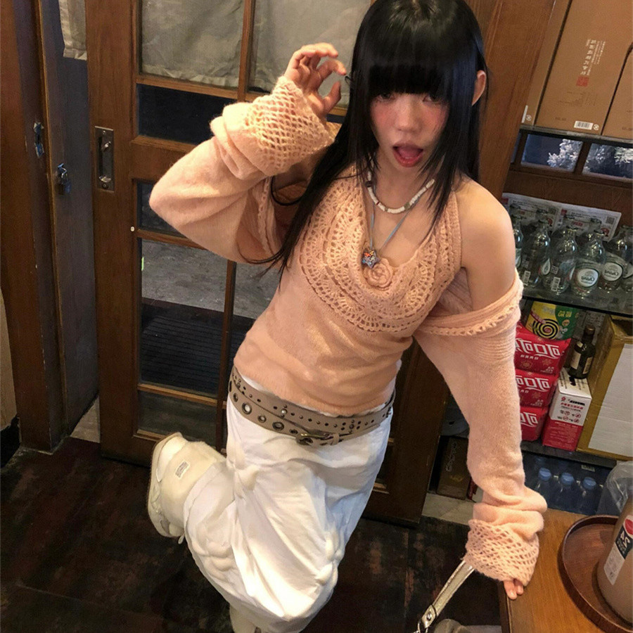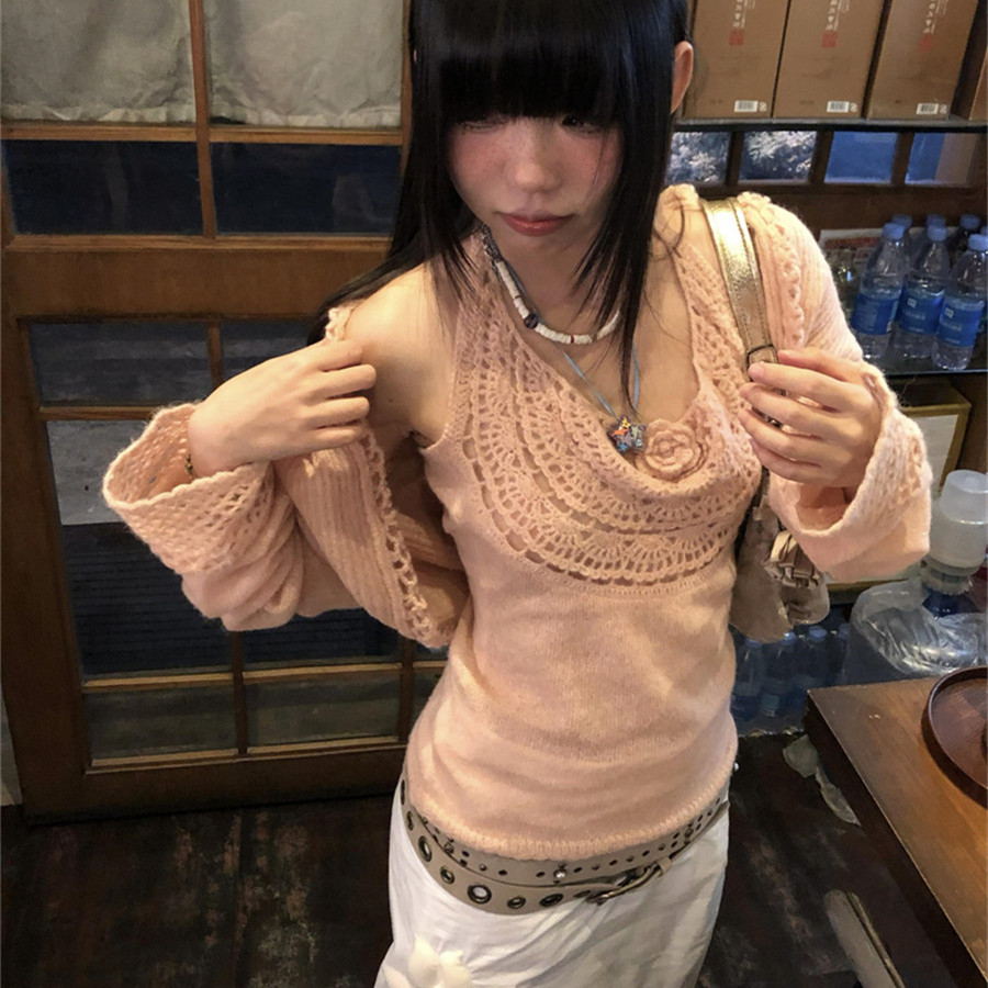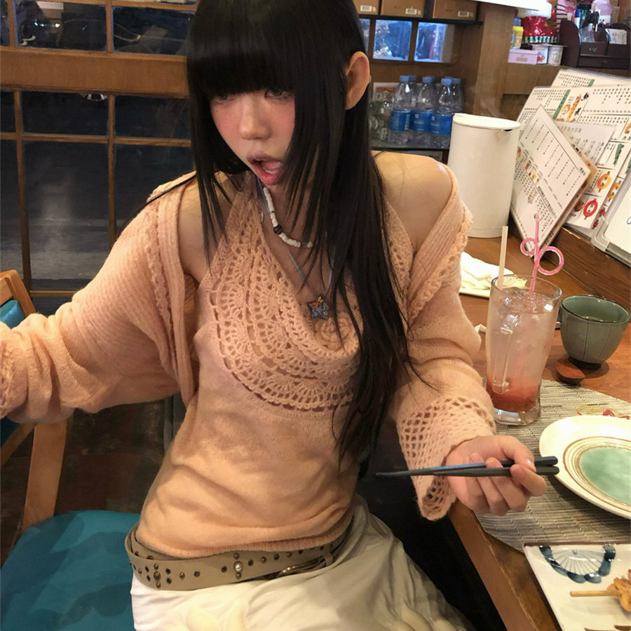 性感纯欲风粉色镂空针织开衫套装
