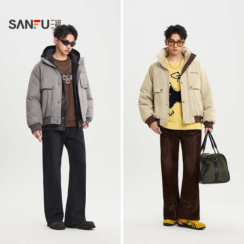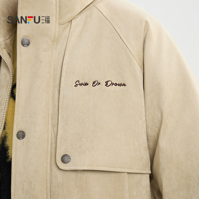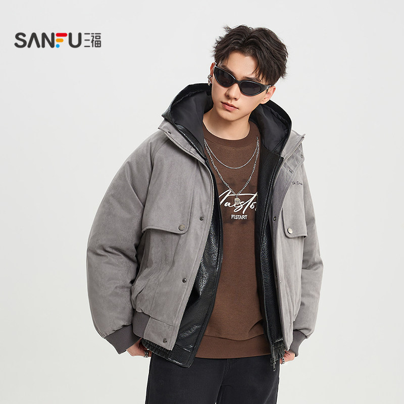 三福2025冬季男士拼色麂皮羽绒服 时尚立领宽松保暖外套513317