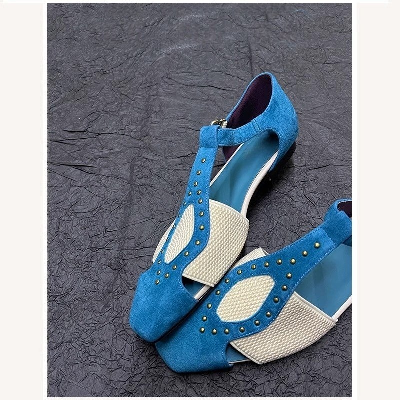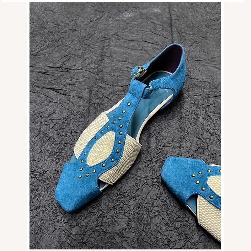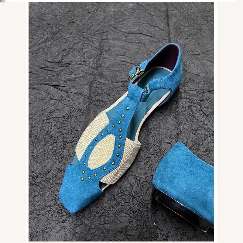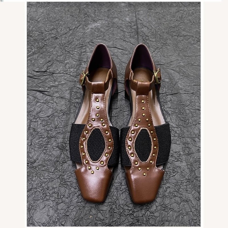 小众设计感铆钉方头单鞋2025年夏季新款英伦风平跟包头罗马凉鞋女