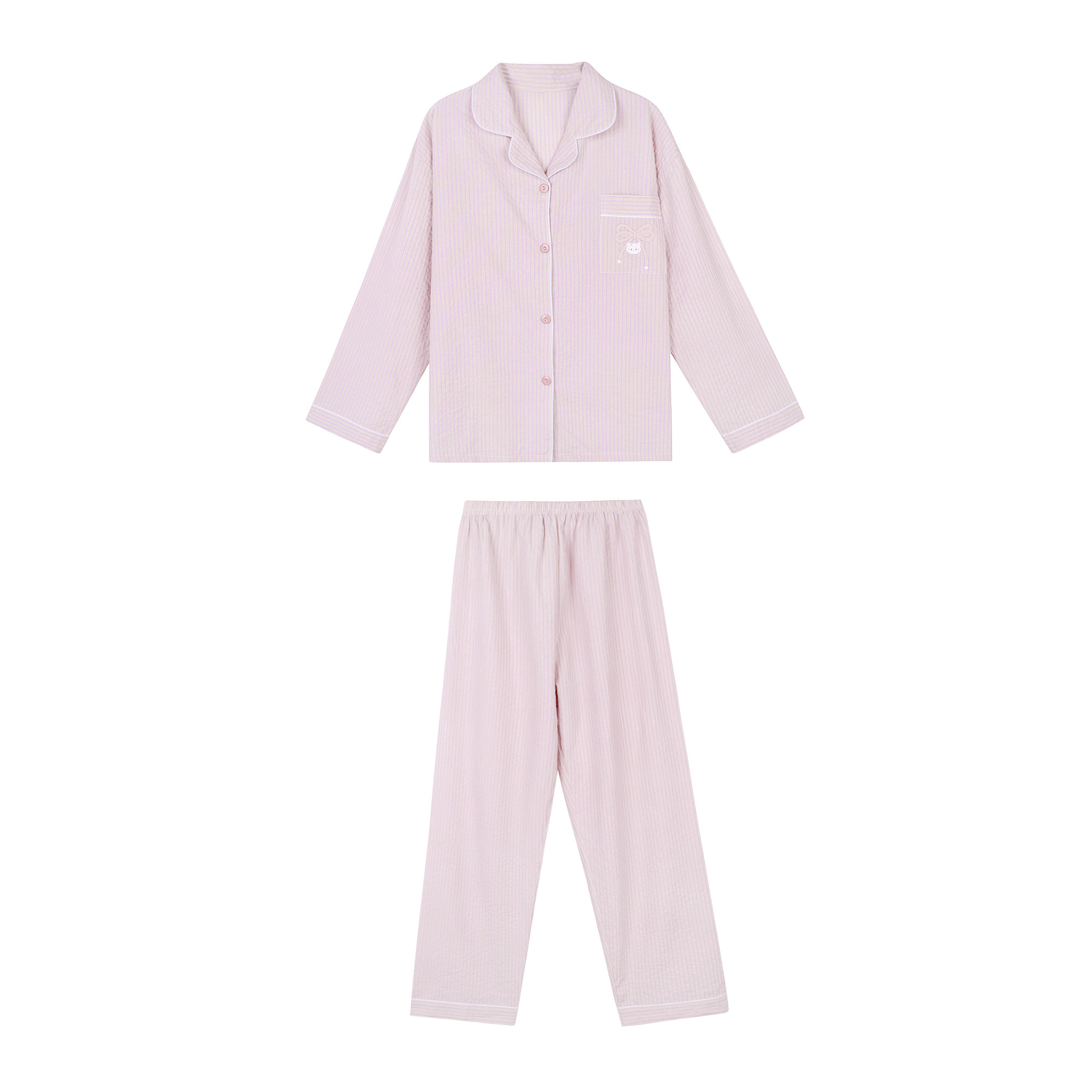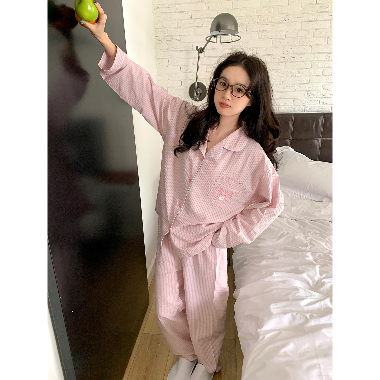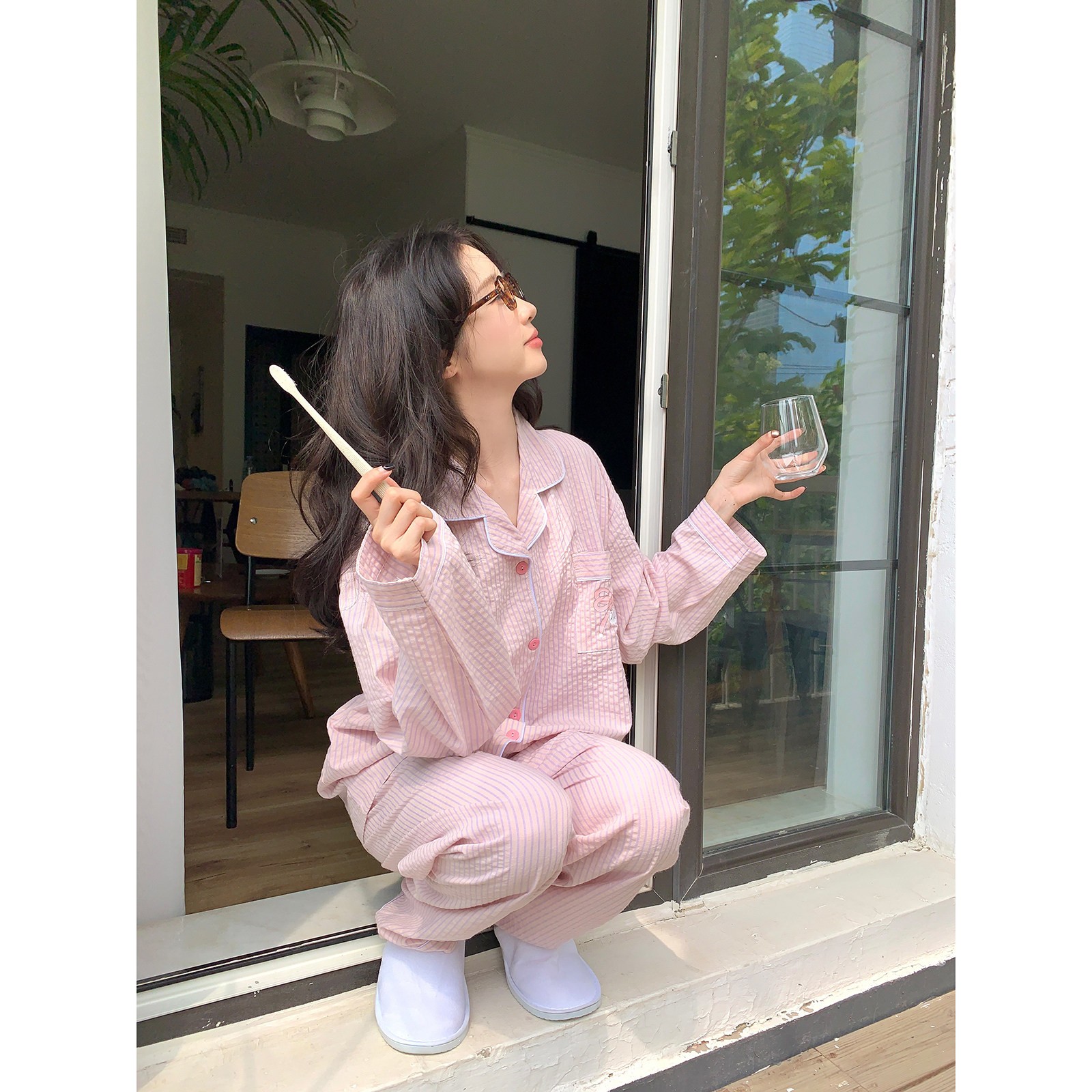 馨帮帮Homedress 可爱翻领条纹长袖睡衣女秋季舒适休闲家居服套装