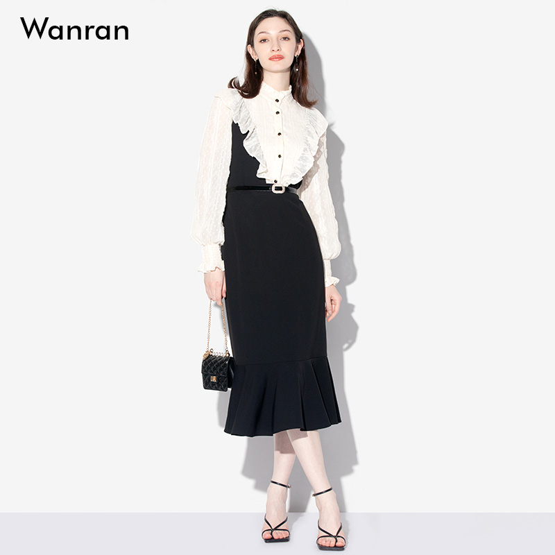 秋季女装2025新款气质撞色修身收腰显瘦鱼尾连衣裙黑色长裙裙子女