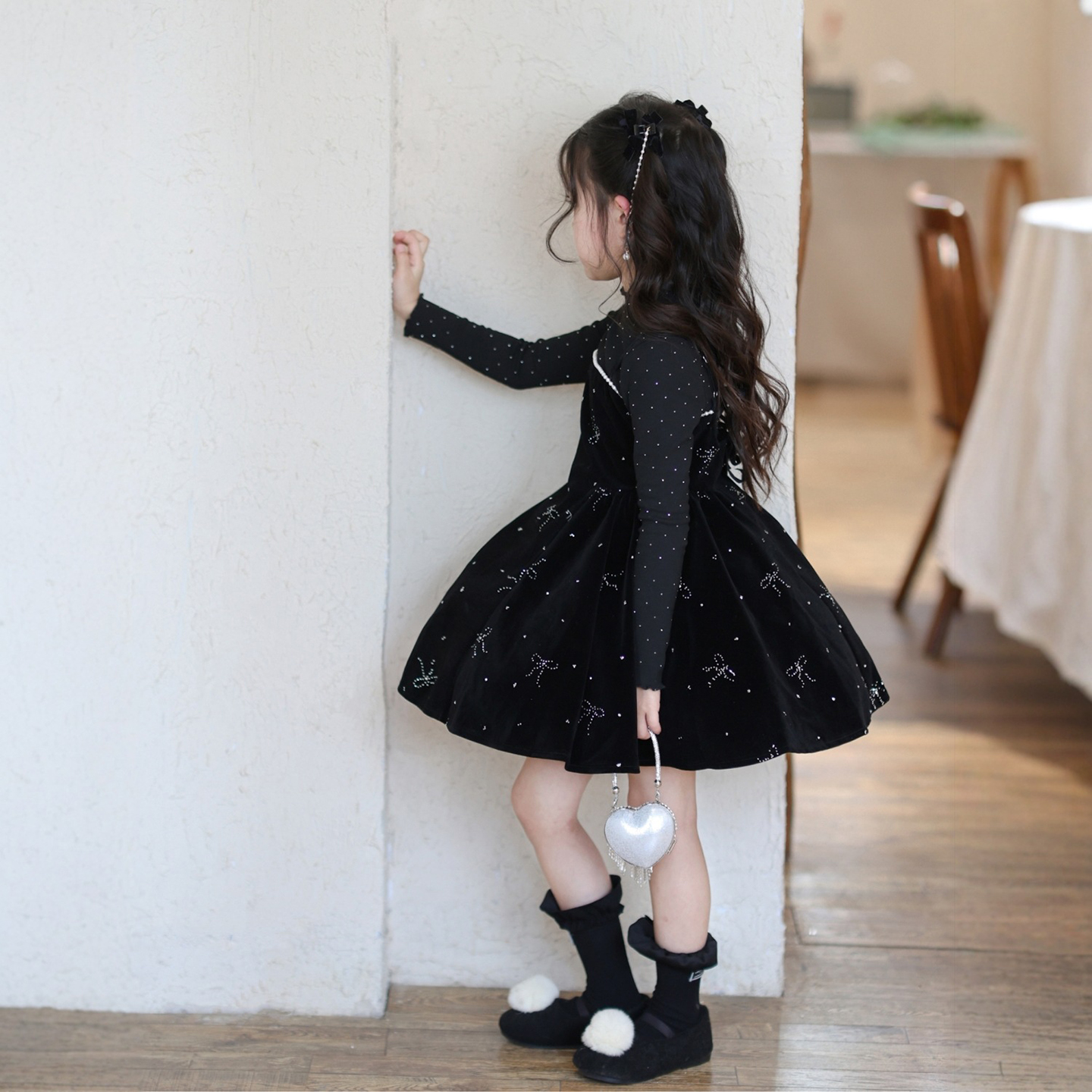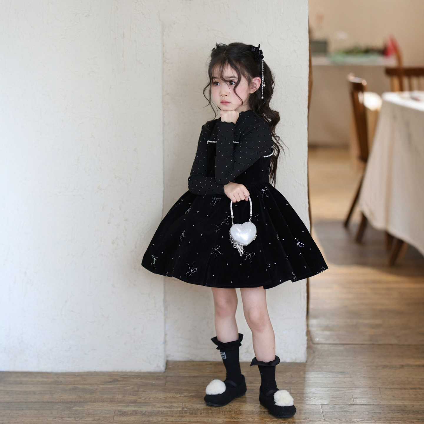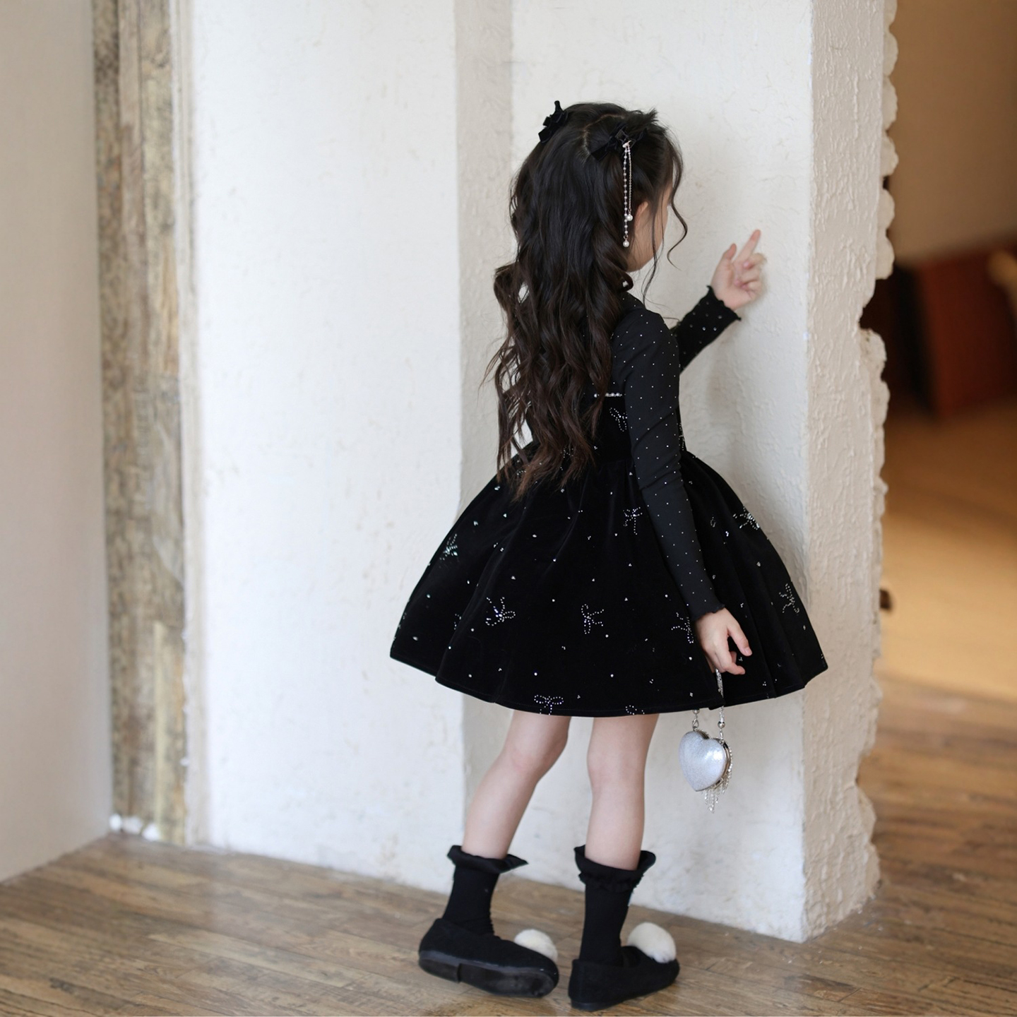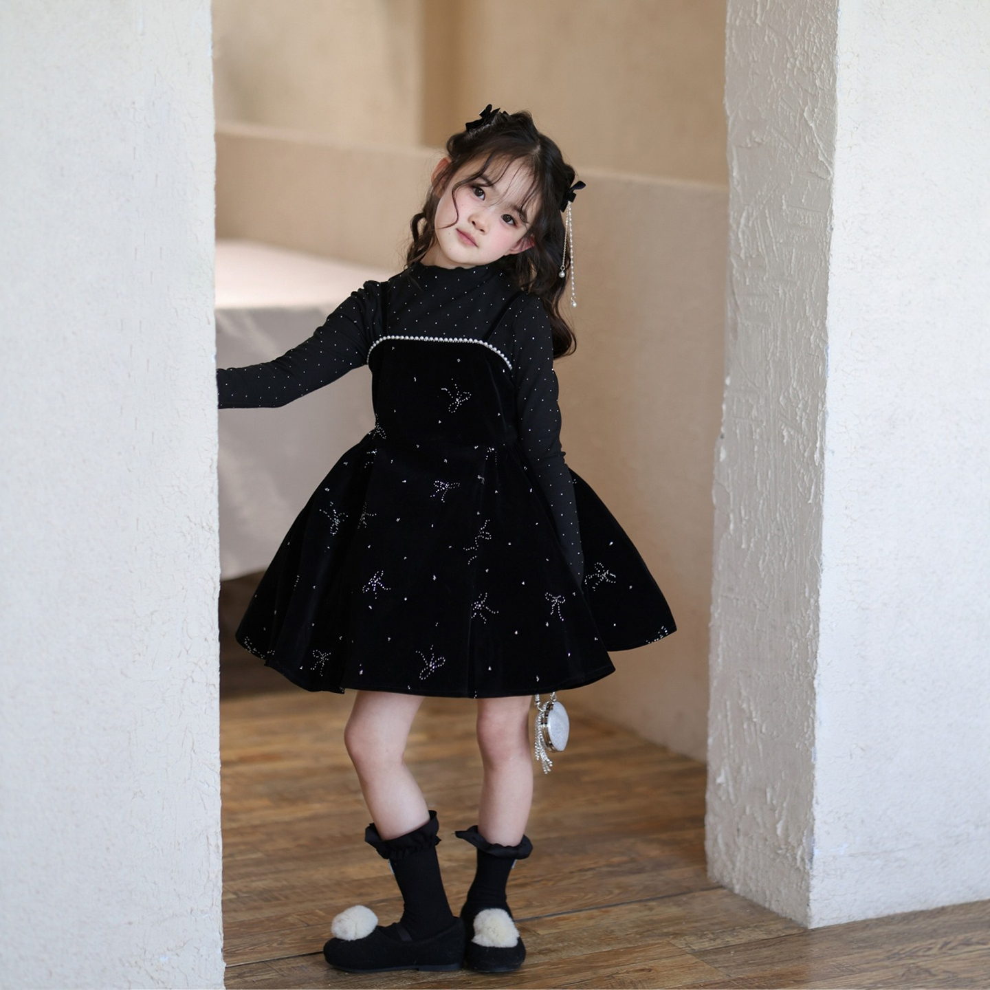女童闪闪蝴蝶结丝绒吊带连衣裙潮