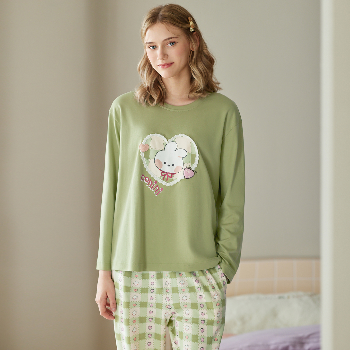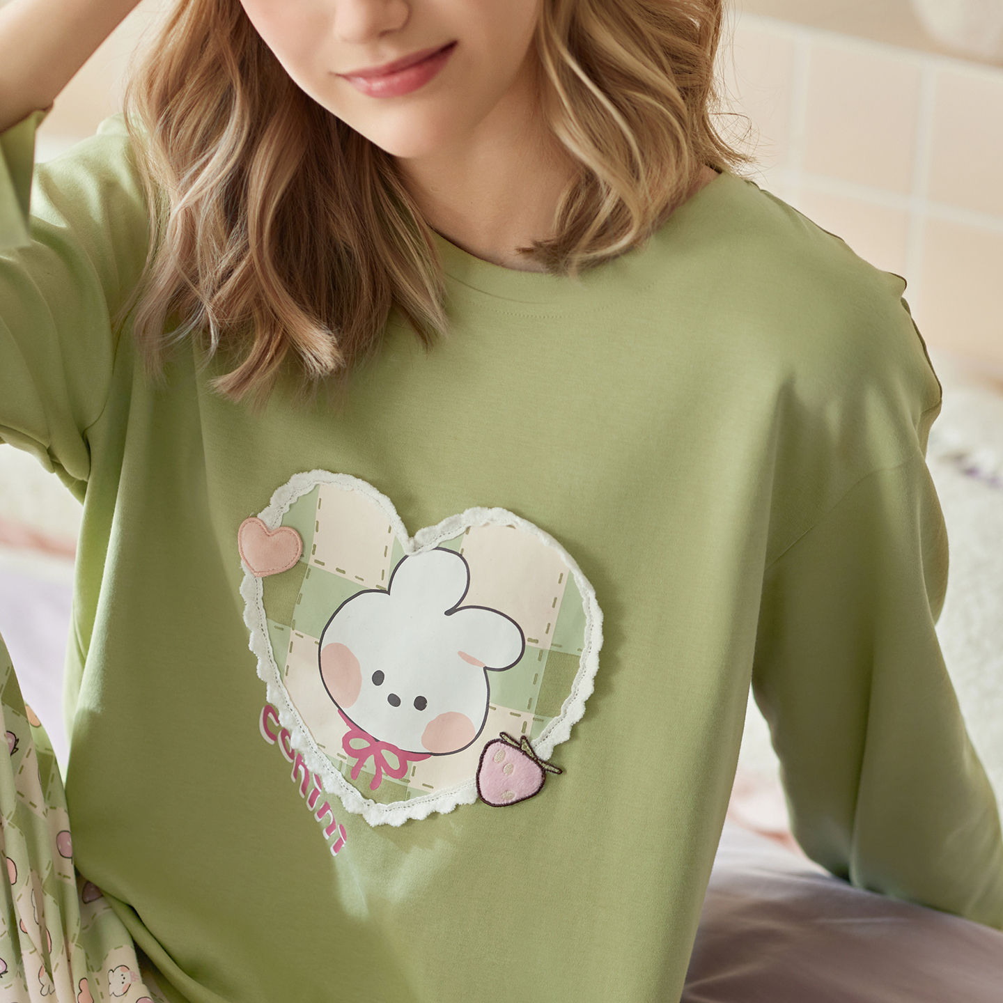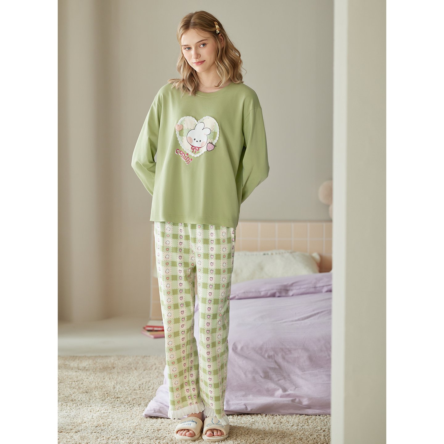 芬腾纯棉睡衣女士春秋季长袖套装卡通可爱布朗熊抗静电大码家居服