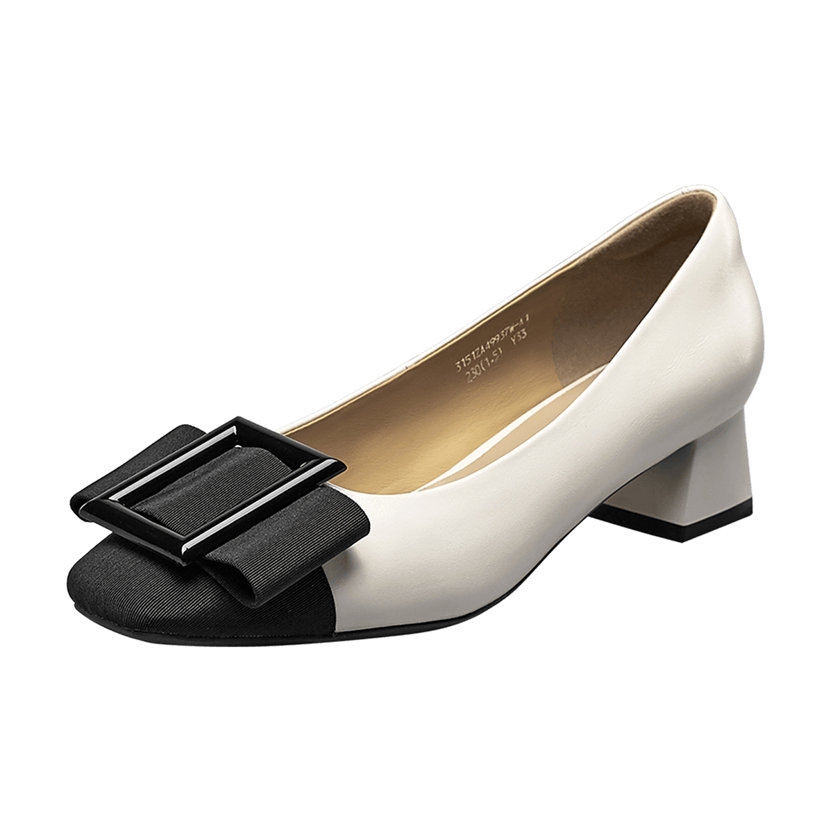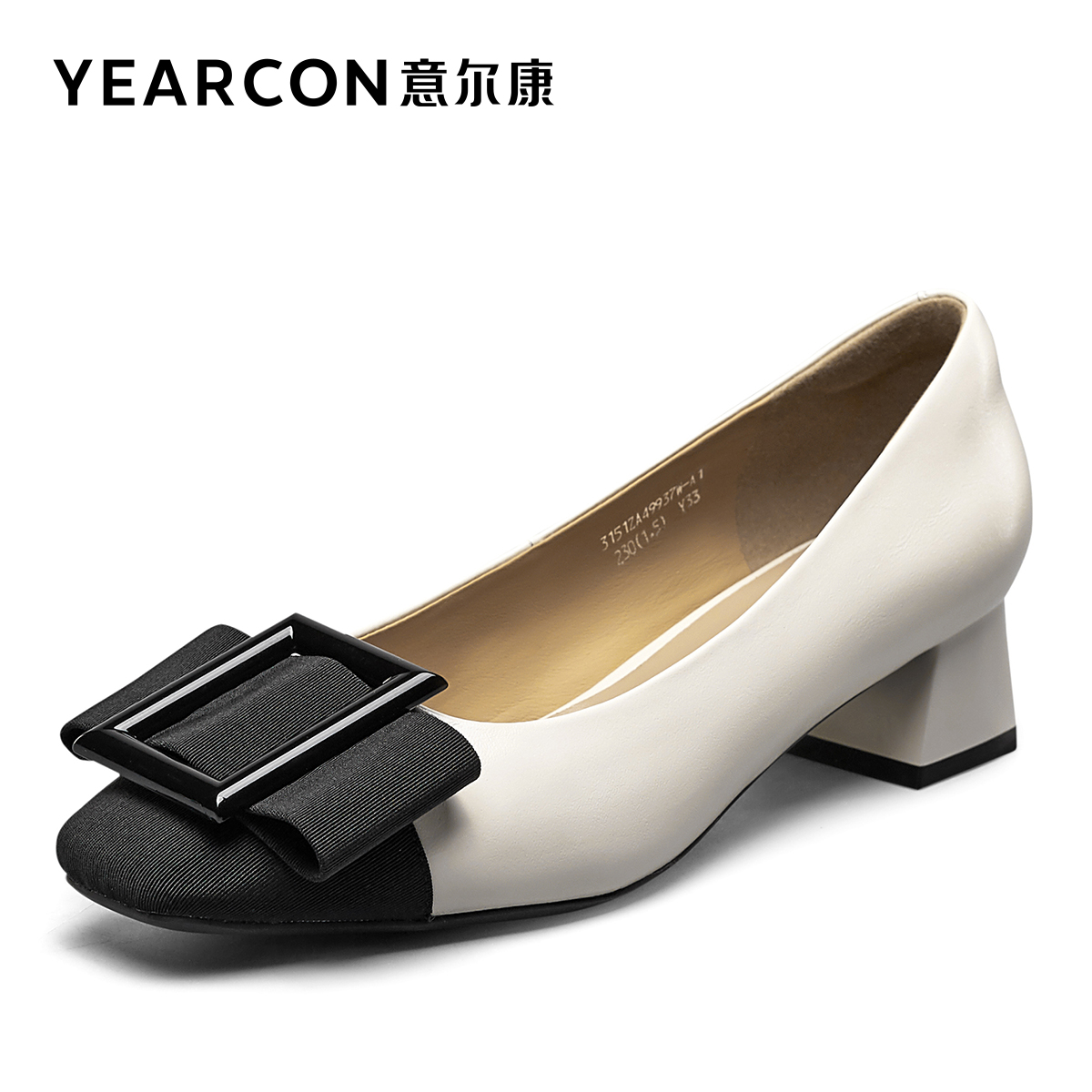 意尔康女鞋春秋季方头粗跟浅口单鞋中跟皮鞋通勤气质工作鞋配裙子