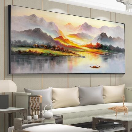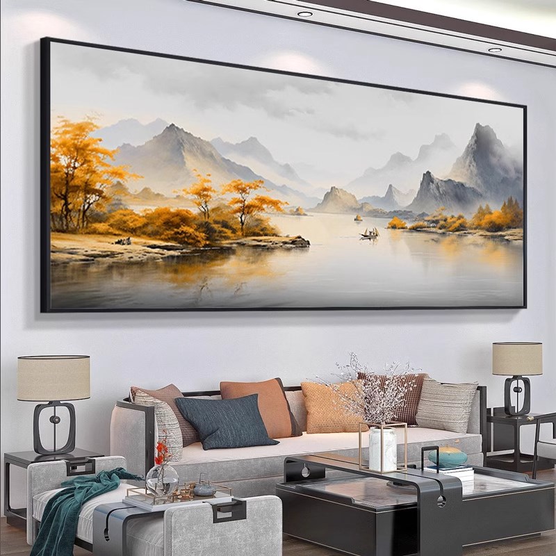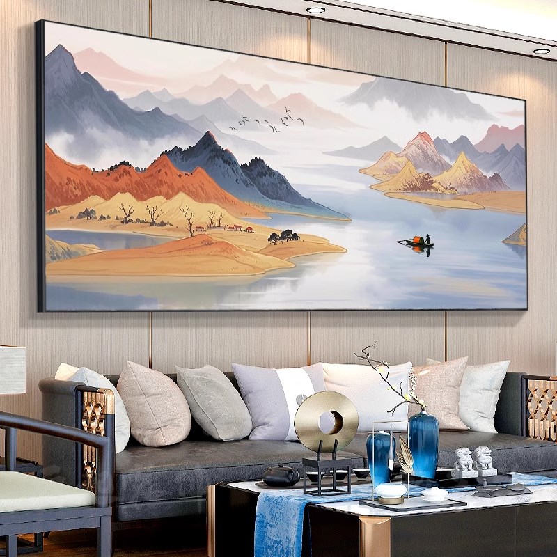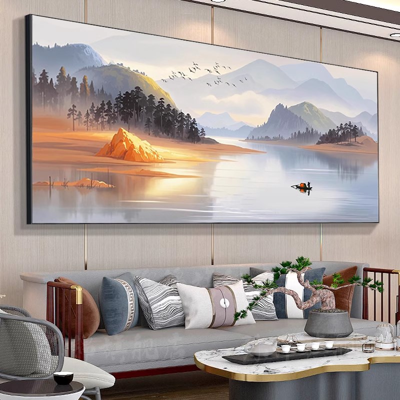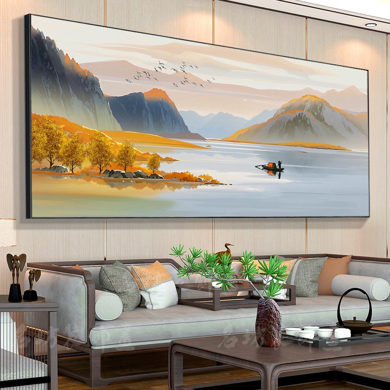 油画质感流水生财客厅装饰画风景C沙发背景墙挂画高档大气横版壁