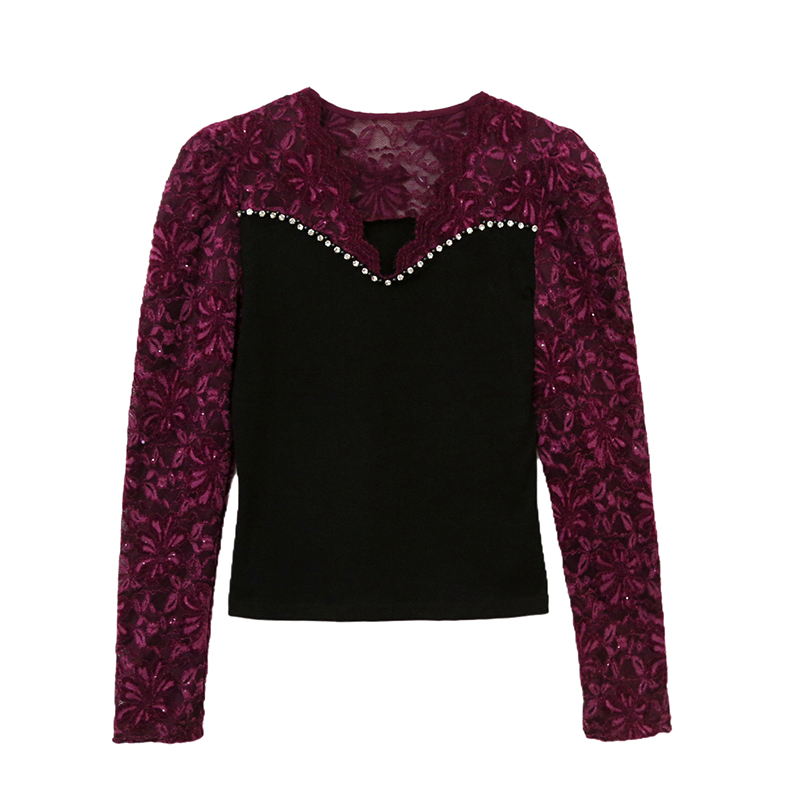 蕾丝拼接打底衫长袖钉珠洋气上衣