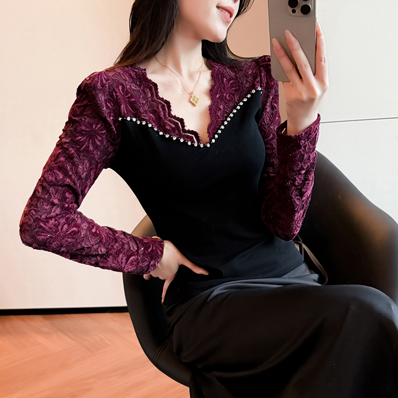 蕾丝拼接打底衫女秋冬欧货性感V领钉珠T恤女长袖紧身内搭洋气上衣