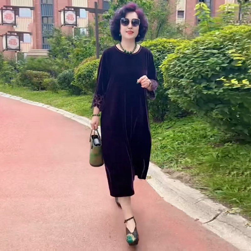 高端洋气年轻妈妈秋冬重工刺绣连衣裙丝绒宽松大码遮肉过膝打底裙