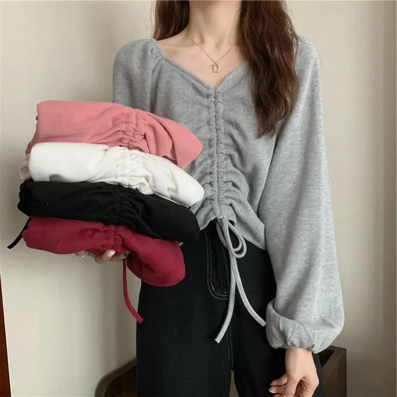 胖MM大码300斤抽绳v领短款长袖T恤女秋季新款200斤设计感小众上衣