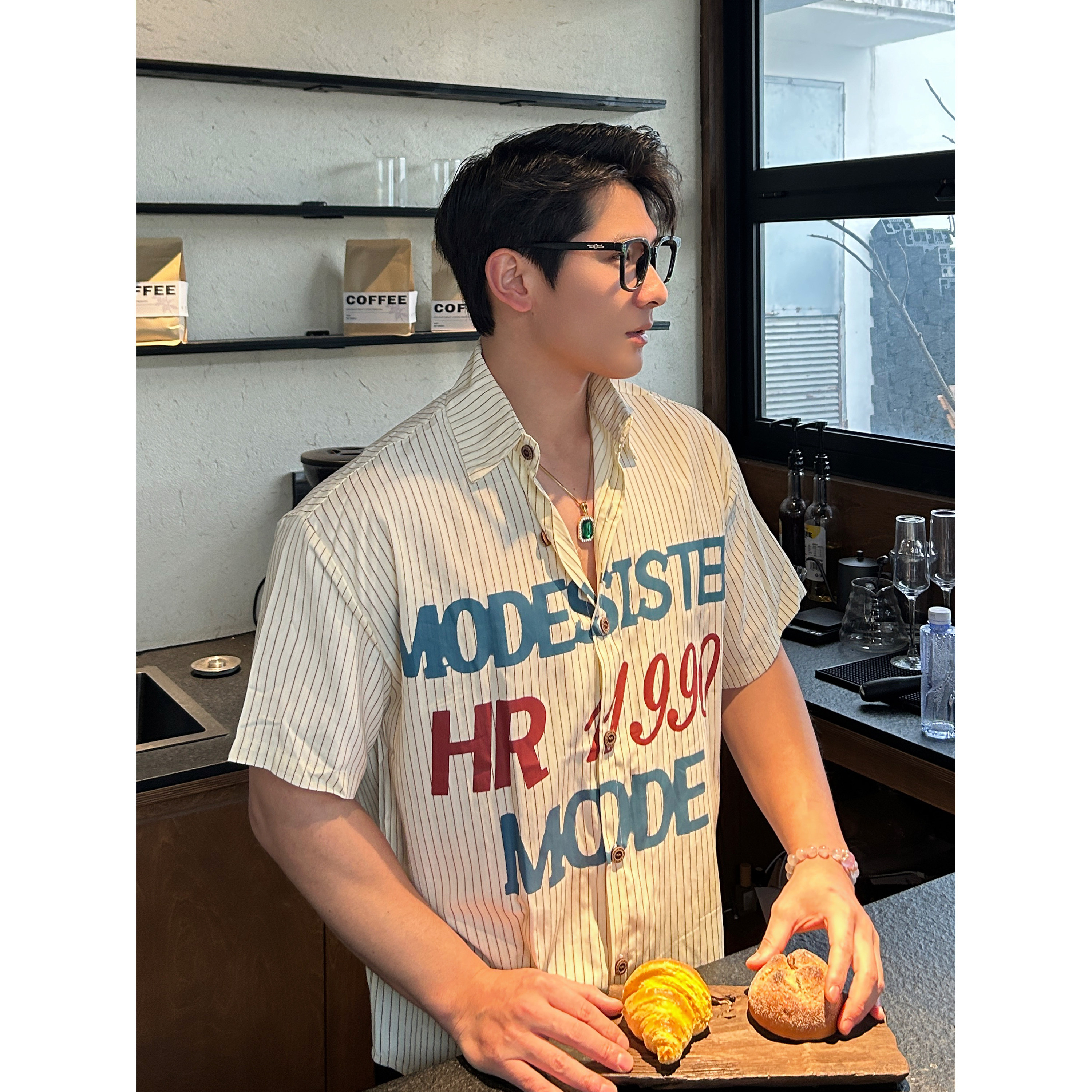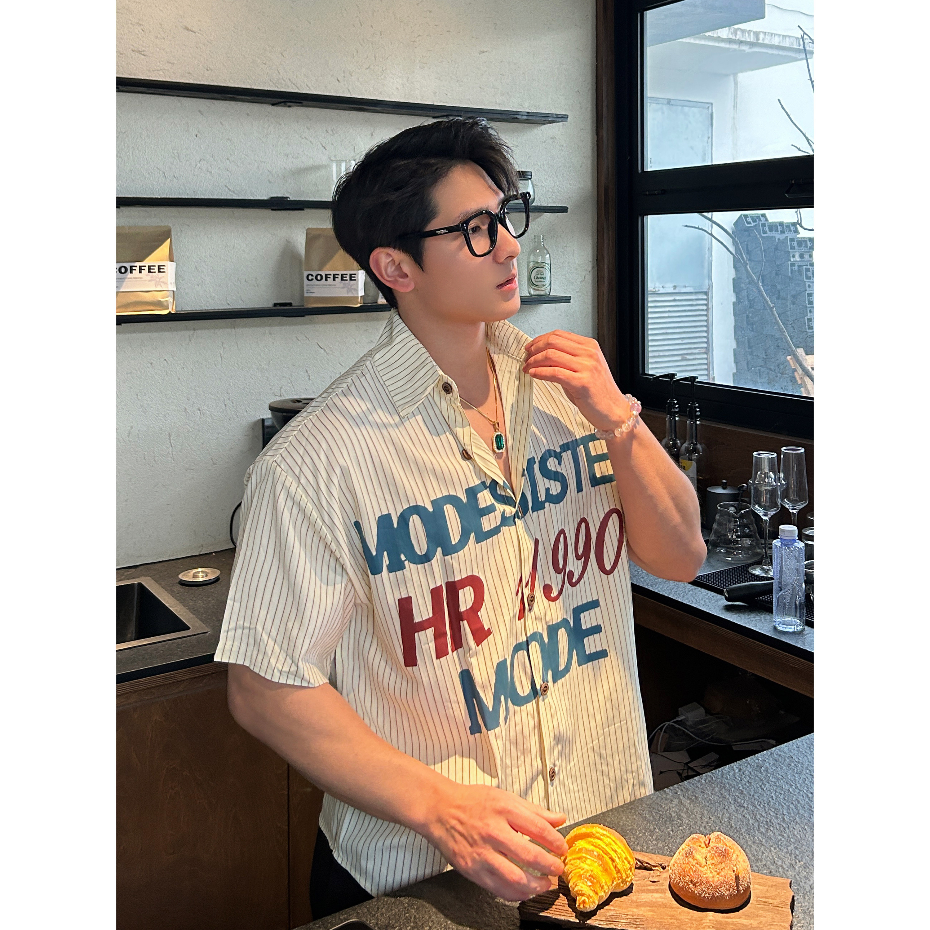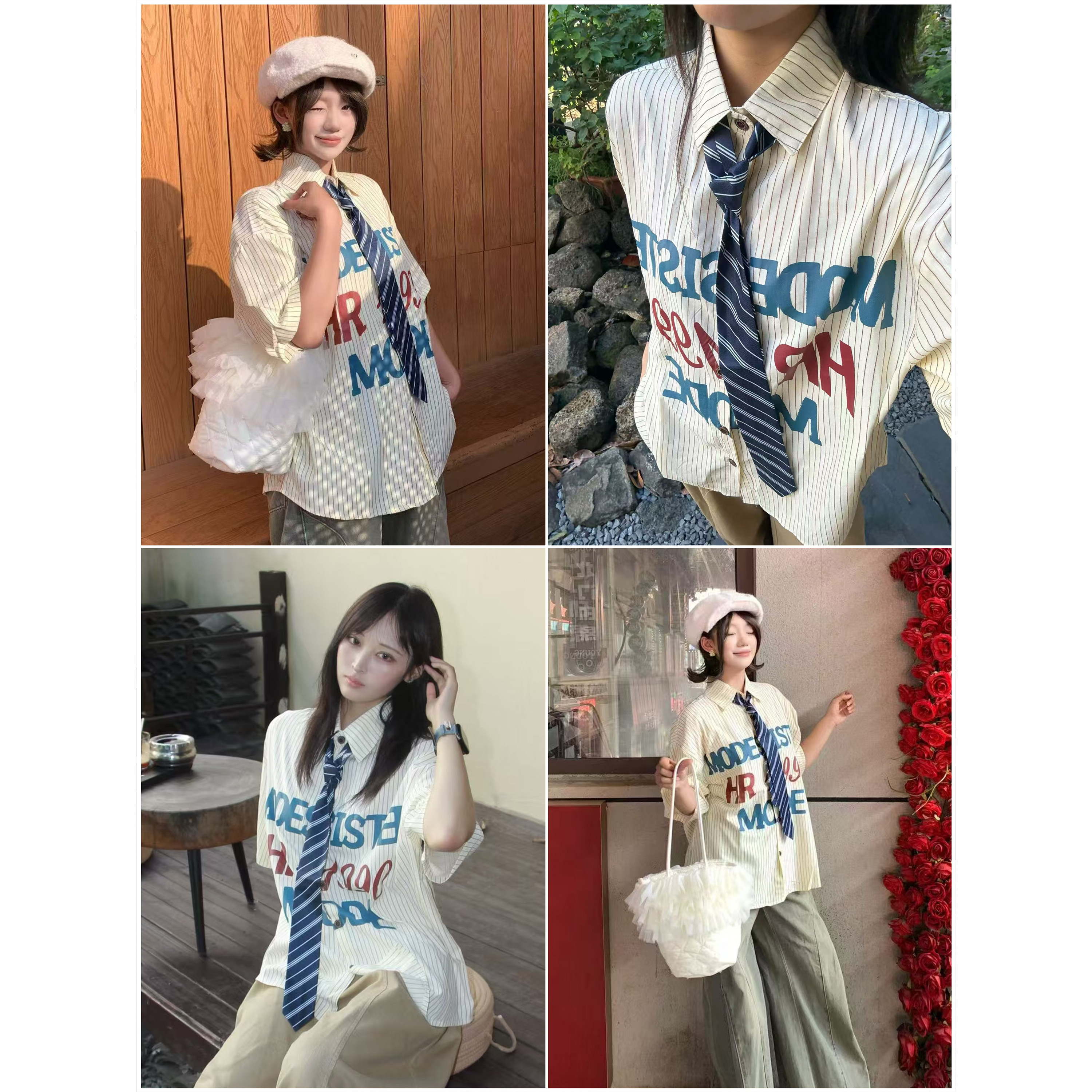 TTYM*复古字母印花条纹领带短袖衬衫男夏季宽松休闲百搭情侣衬衣