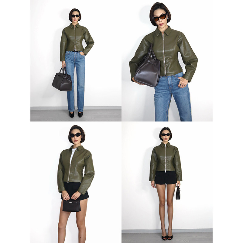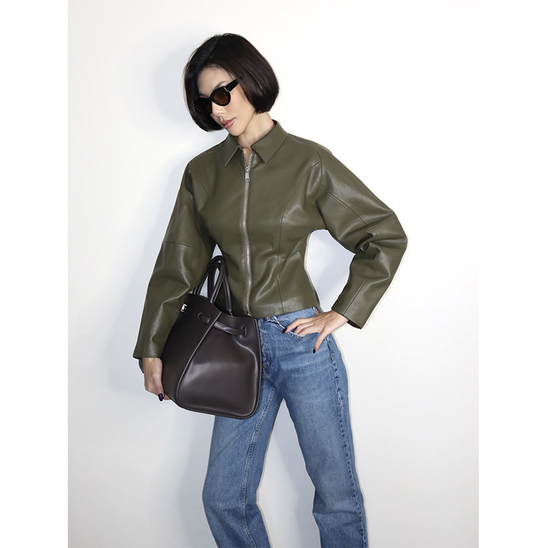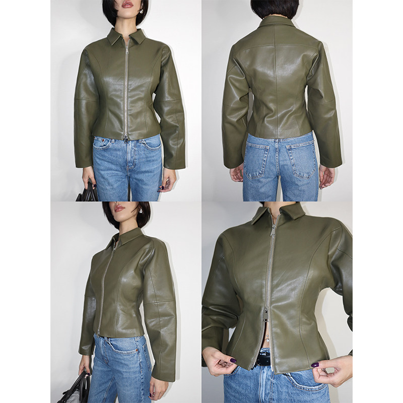 VanessaLab 秋冬巴恩风皮夹克复古修身收腰橄榄绿短款皮衣外套女