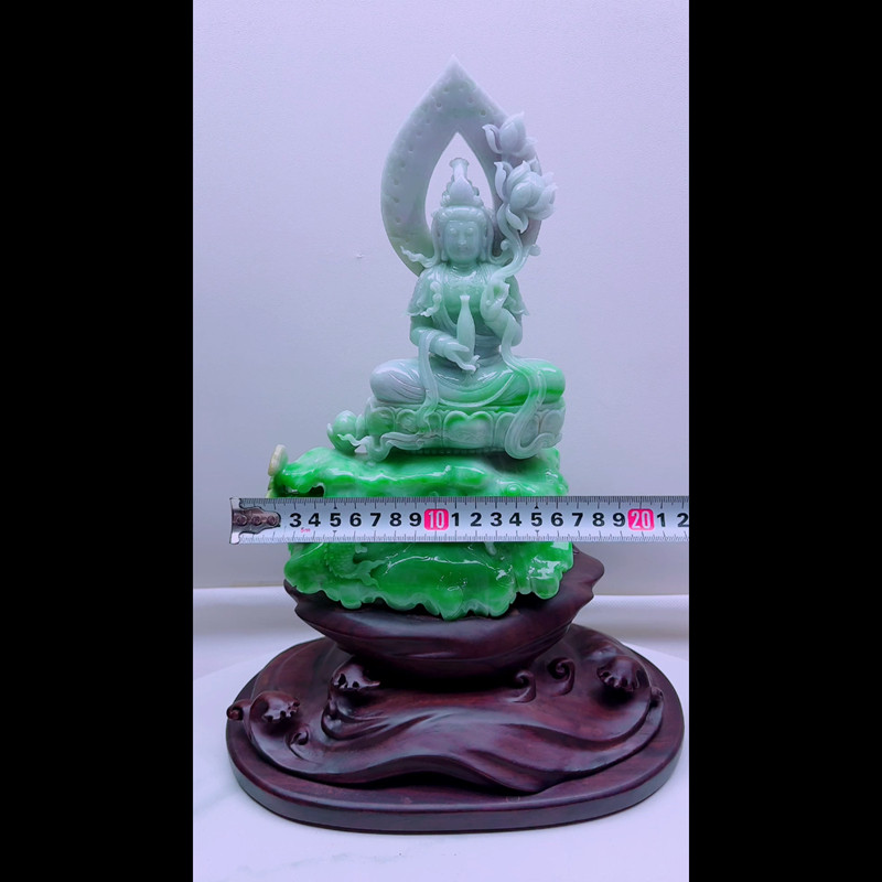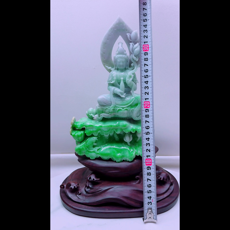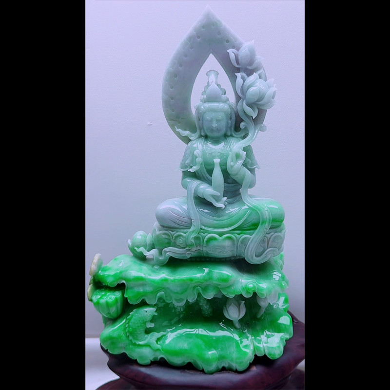 缅甸天然A货玉石翡翠孤品 精雕老坑双彩紫绿阳绿观音菩萨摆件