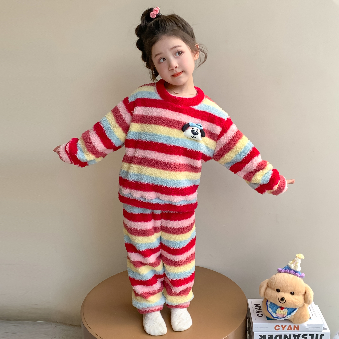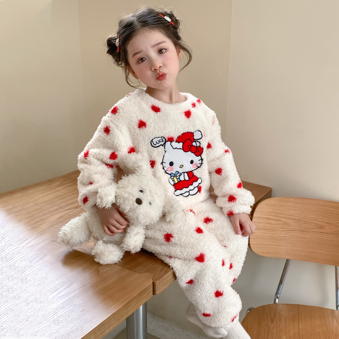儿童睡衣女童秋冬款法兰绒女宝宝卡通猫咪可爱家居服套装2025新款