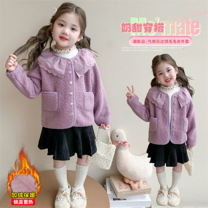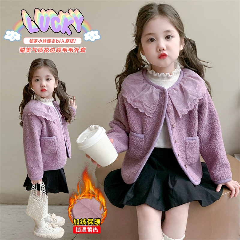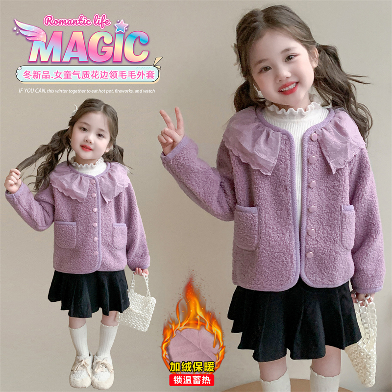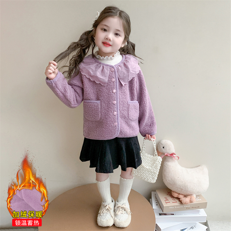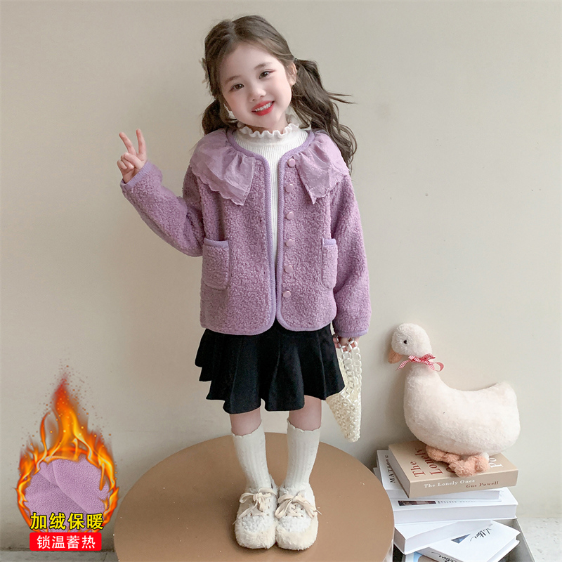 女童花边领加绒外套2025秋冬装新款儿童紫色保暖女宝宝洋气毛毛衣
