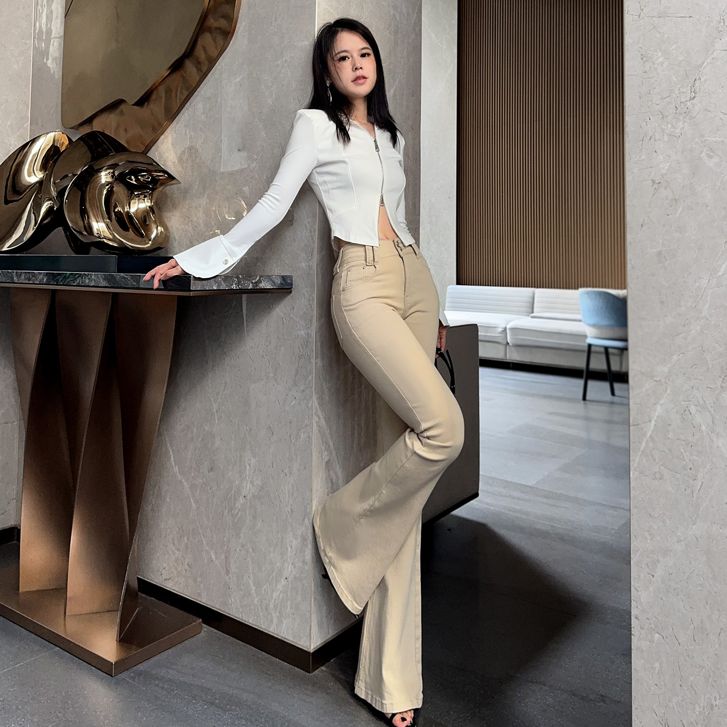 杨杨 复古卡其色微喇叭牛仔裤女2025秋高腰修身显瘦弹力拖地长裤