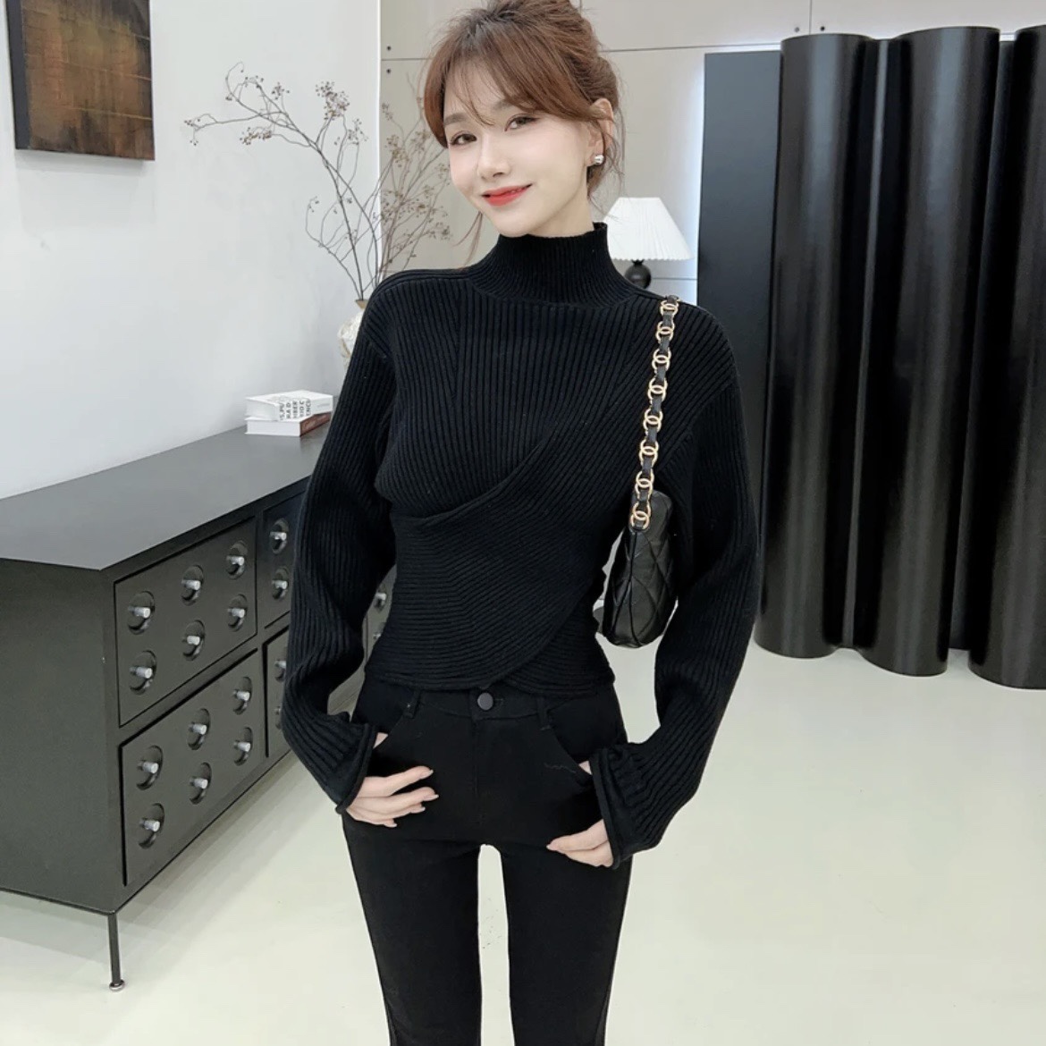 卡卡女装官方旗舰正品轻熟设计感收腰假两件交叉腰短毛衣针织衫女